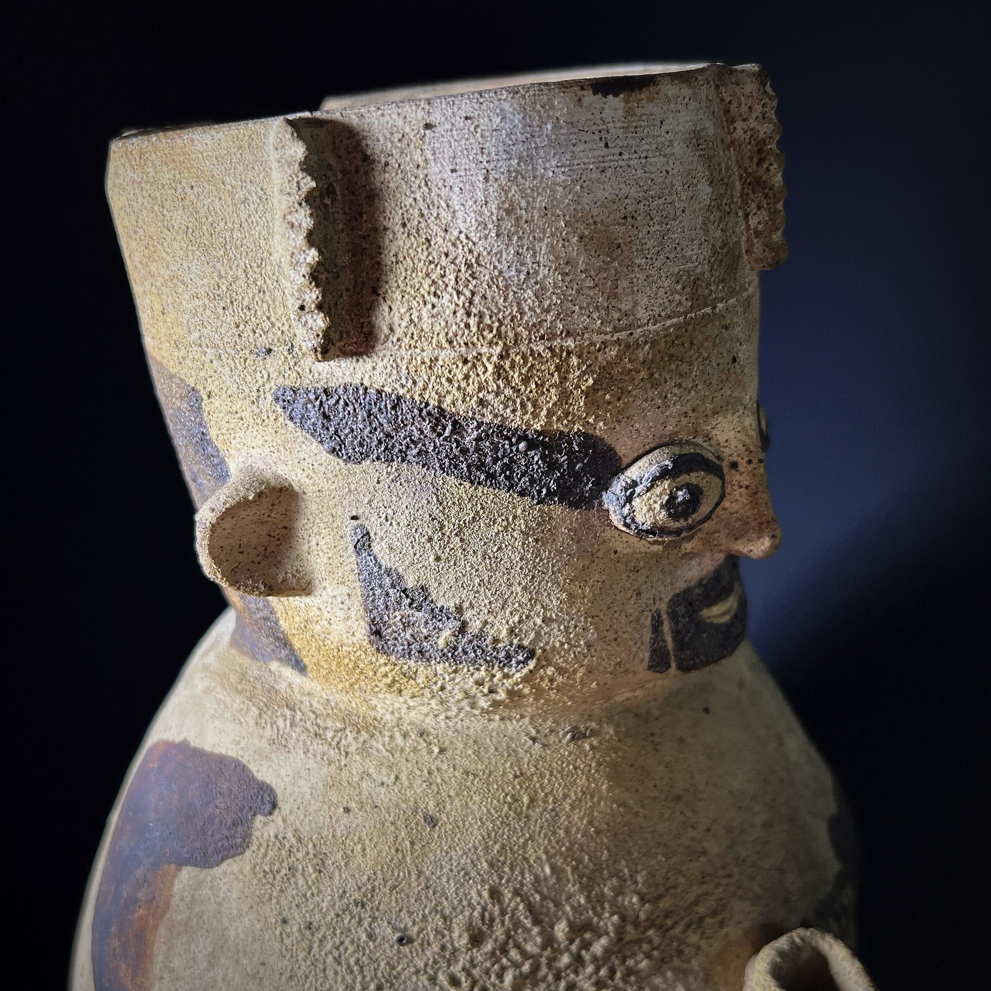 The stylized figure presents a voluminous, egg-shaped body tapering into a vertical neck with a slightly flared rim. His cylindrical head is rendered with expressive oval eyes and dilated pupils, evoking a trance-like state, while a pointed nose, pursed lips, and jutting chin lend striking individuality. Intricate facial markings, perhaps tattoos or ritual paint, adorn his eyes, mouth, and cheeks, enhancing his commanding presence.