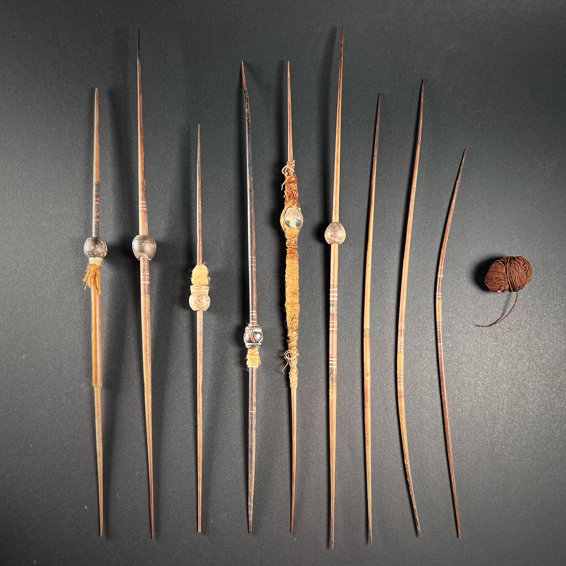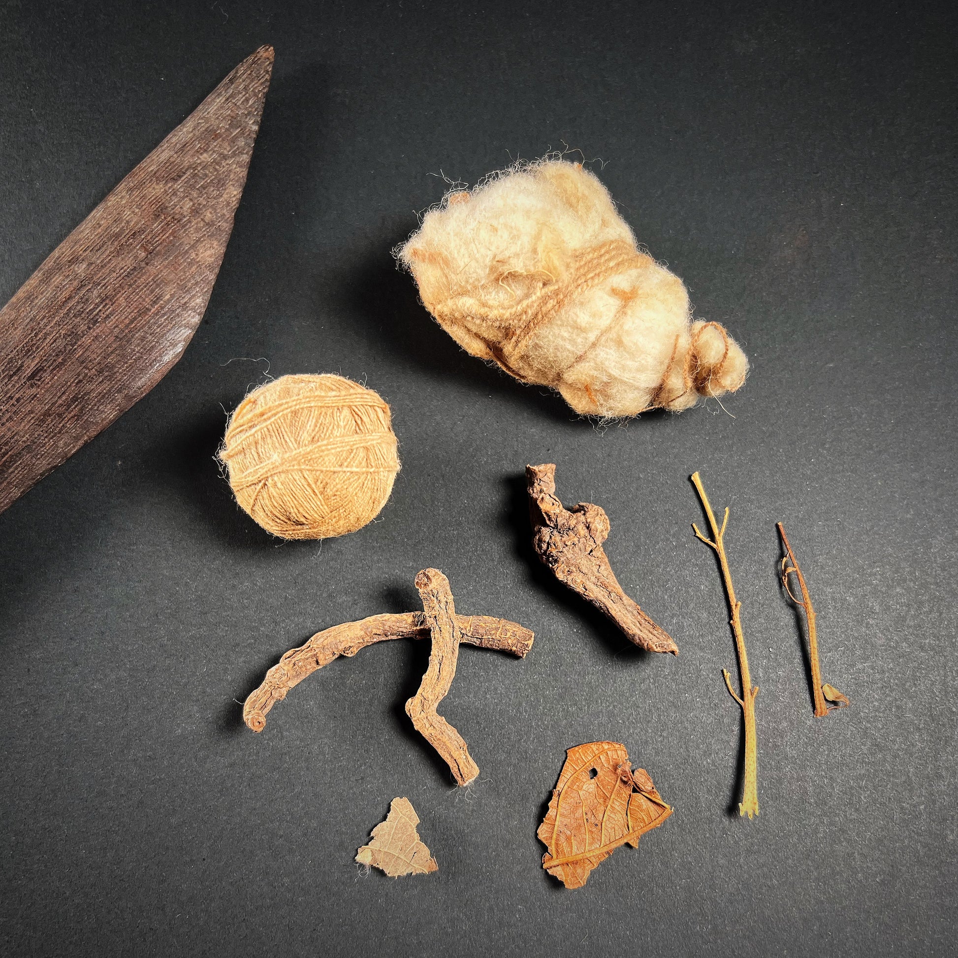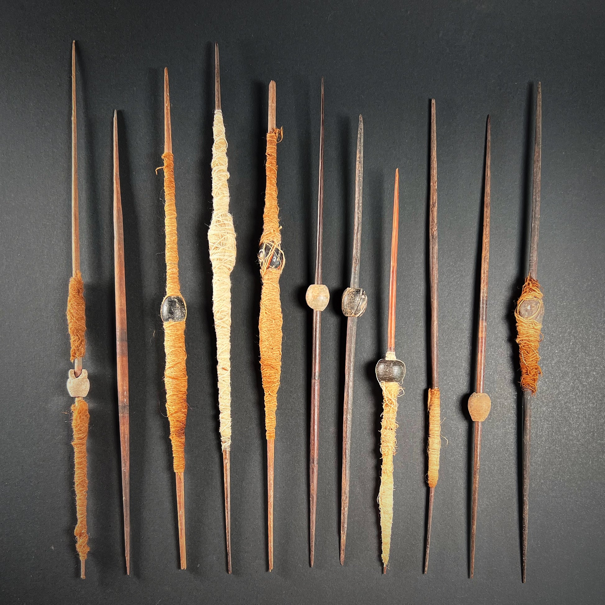Inside are numerous spindles, four of which are broken, many still wound with ancient textile thread in natural and dyed hues. Several spindles retain painted and intricately incised ceramic whorls or small clay balls, likely used as weights or decoration. Accompanying the spindles are small balls of spun thread, a wooden batten or beater stick, a wad of raw cotton, and botanical fragments—perhaps used for dyes or ceremonial purposes. Each component is authentic, ancient, and was originally discovered within the basket as a complete set.