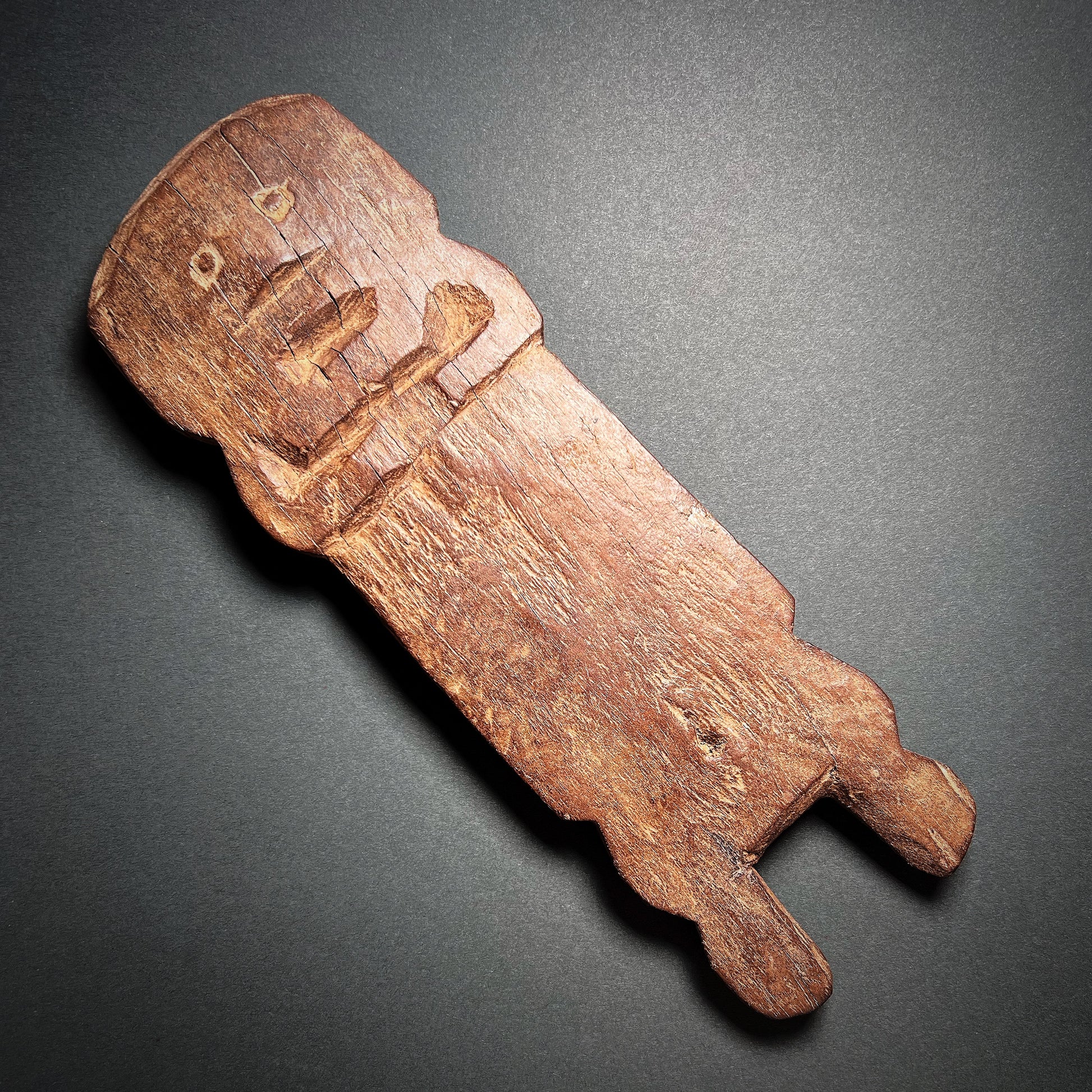 Excellent condition. Expected chips, nicks, abrasions, and softening of incised detail, all commensurate with age. Rich dark patina. Size approx. 24,1cm x 8,1cm x 2,3cm.