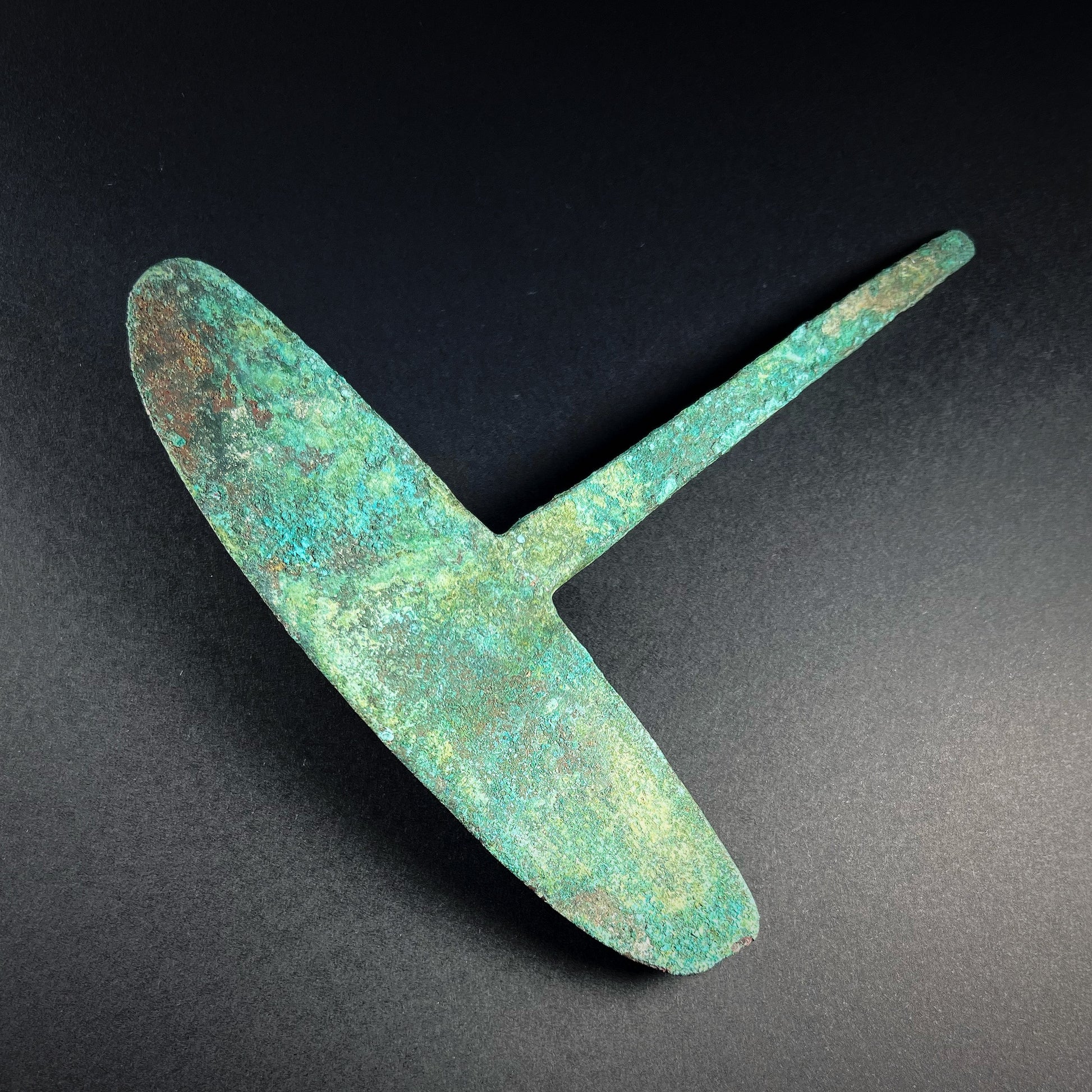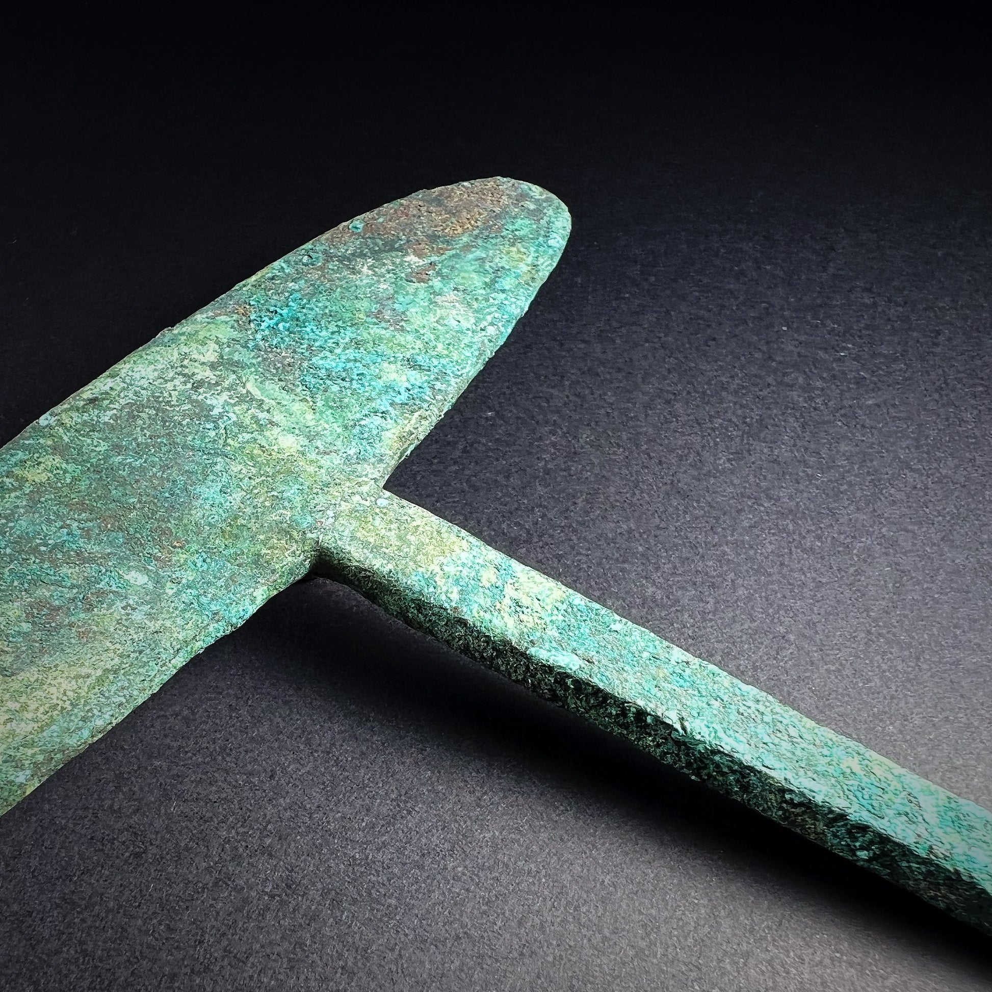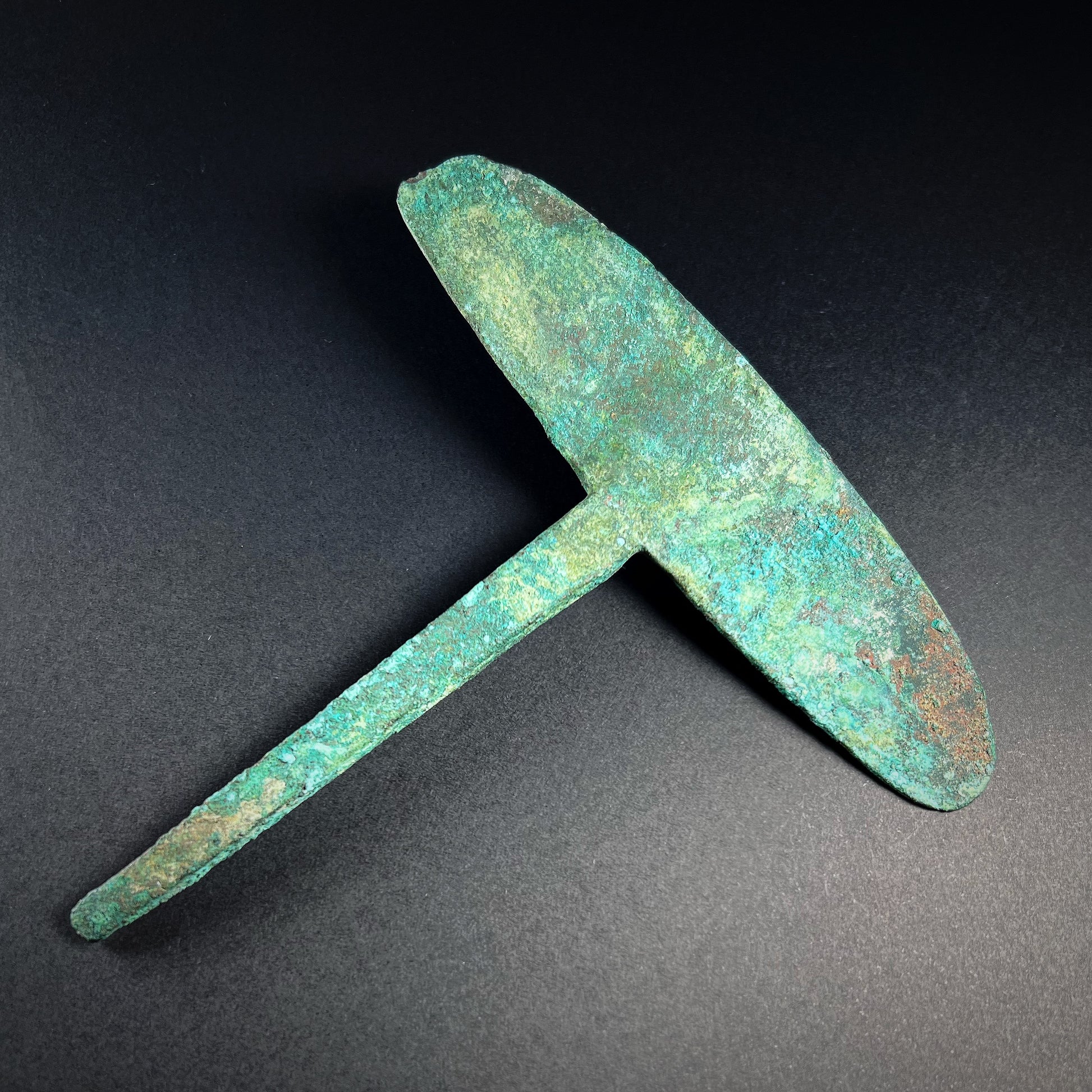 Good condition. Wear commensurate with age and use. Chip. Heavy green surface patina and encrusted mineral deposits. Light remains of ancient textile fragments and impressions on the surface. Size approx. 13,7cm x 3,3cm (blade 13,5cm) x 0,4cm.