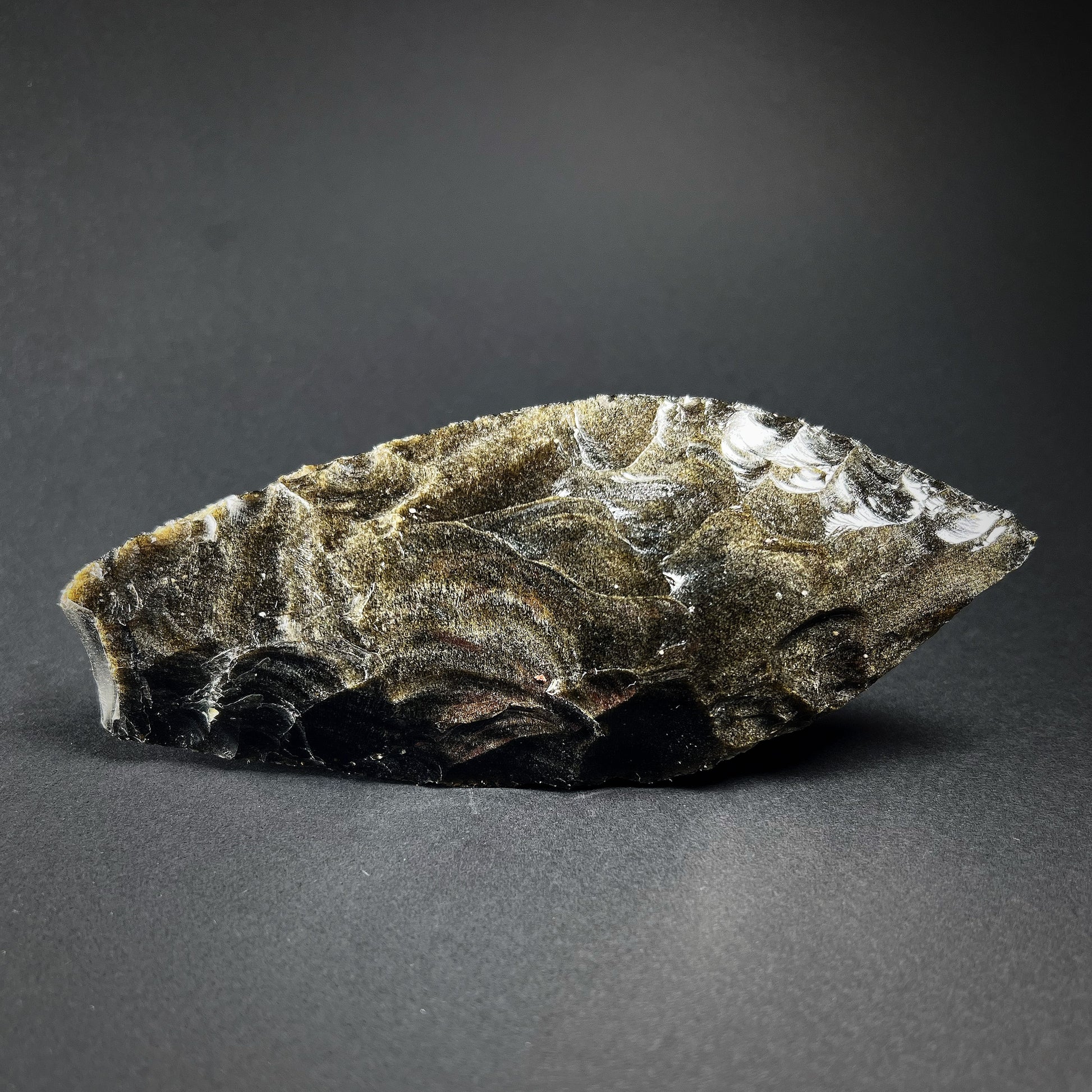 This extraordinary and sizable obsidian axe, crafted during the Protoclassic period, exemplifies the technical skill and cultural significance of ancient Mesoamerican artisans. Fashioned from a deep, forest-green obsidian with delicate golden hues, the axe features a distinctive elongated, spade-shaped form with lightly convex faces, sharpened edges, and a wide tail that culminates in a broad point. Its narrow tip, though slightly worn, hints at the sharp precision and utility that characterized such tools.