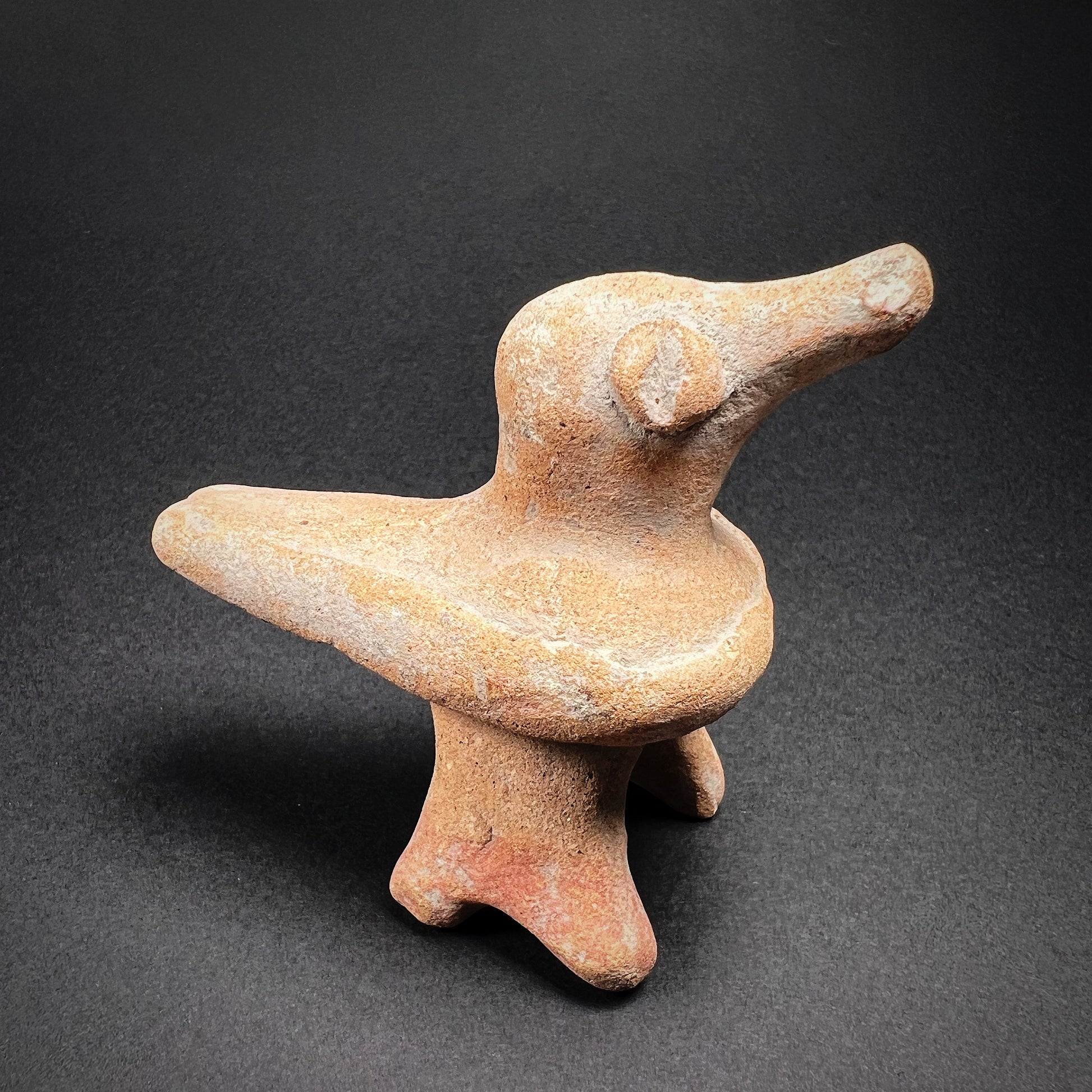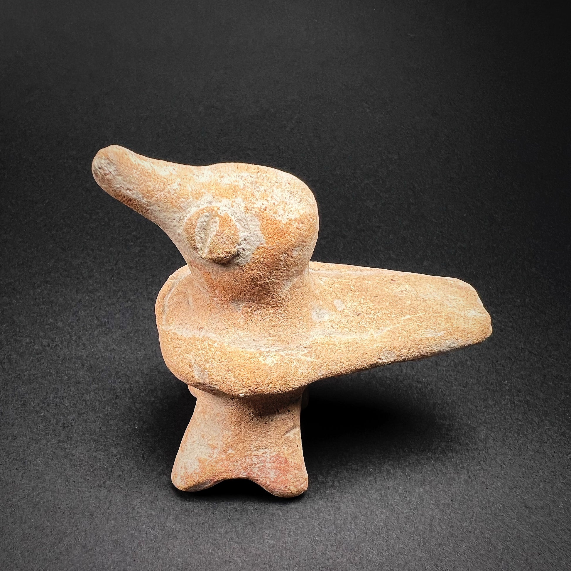 Colima ceramics from the Comala phase (200 BC–300 AD) are renowned for their wide thematic diversity and exceptional craftsmanship. Unlike the related traditions of Jalisco and Nayarit, Colima figurines are noted for their smooth, burnished surfaces, minimal use of color, and highly compact forms. While human figures dominate Colima art—depicting musicians, dwarfs, and hunchbacks, among other subjects—animal representations, such as this bird, reflect a deep cultural appreciation for the natural world.