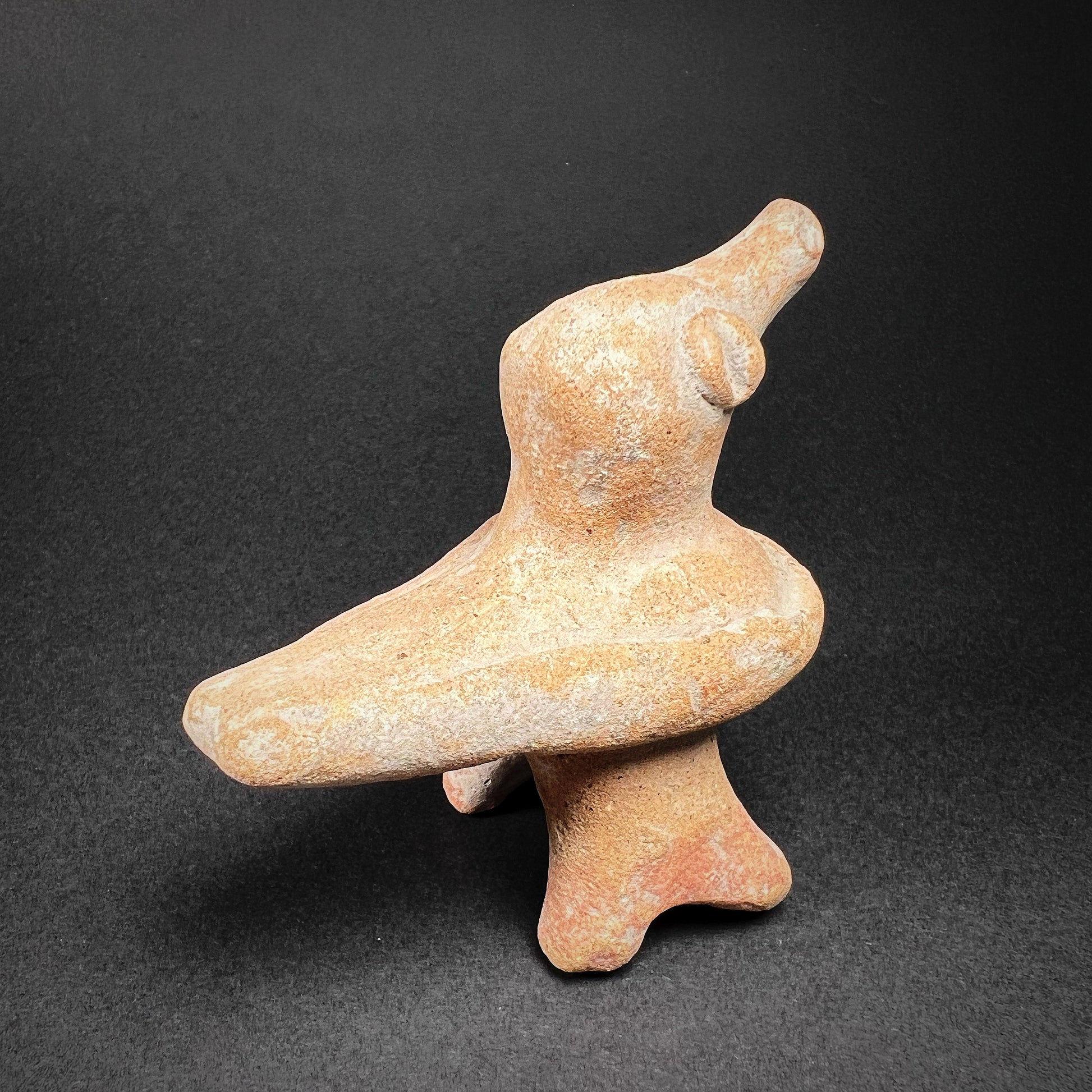 Substyles like Tuxcacuesco-Ortices exhibit unique traits while maintaining the cohesive aesthetic of Colima ceramics. The simplicity of this bird figurine, combined with its polished finish and expressive design, embodies the Colima artisans' skill in transforming clay into lively, meaningful forms. This piece stands as a testament to the sophisticated artistic traditions of ancient Mesoamerica and offers insight into the cultural symbolism of the Colima people. A striking artifact, it would enhance any collection of Pre-Columbian art with its charm and historical significance.
