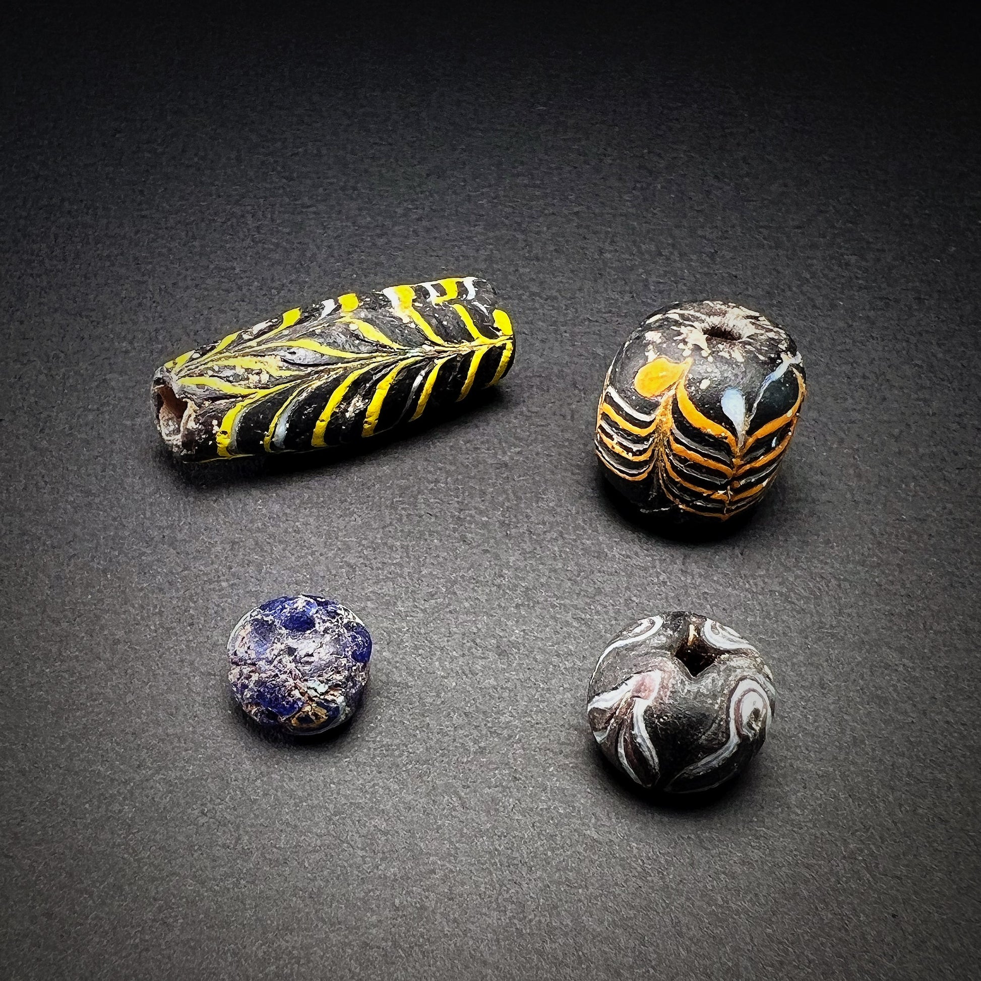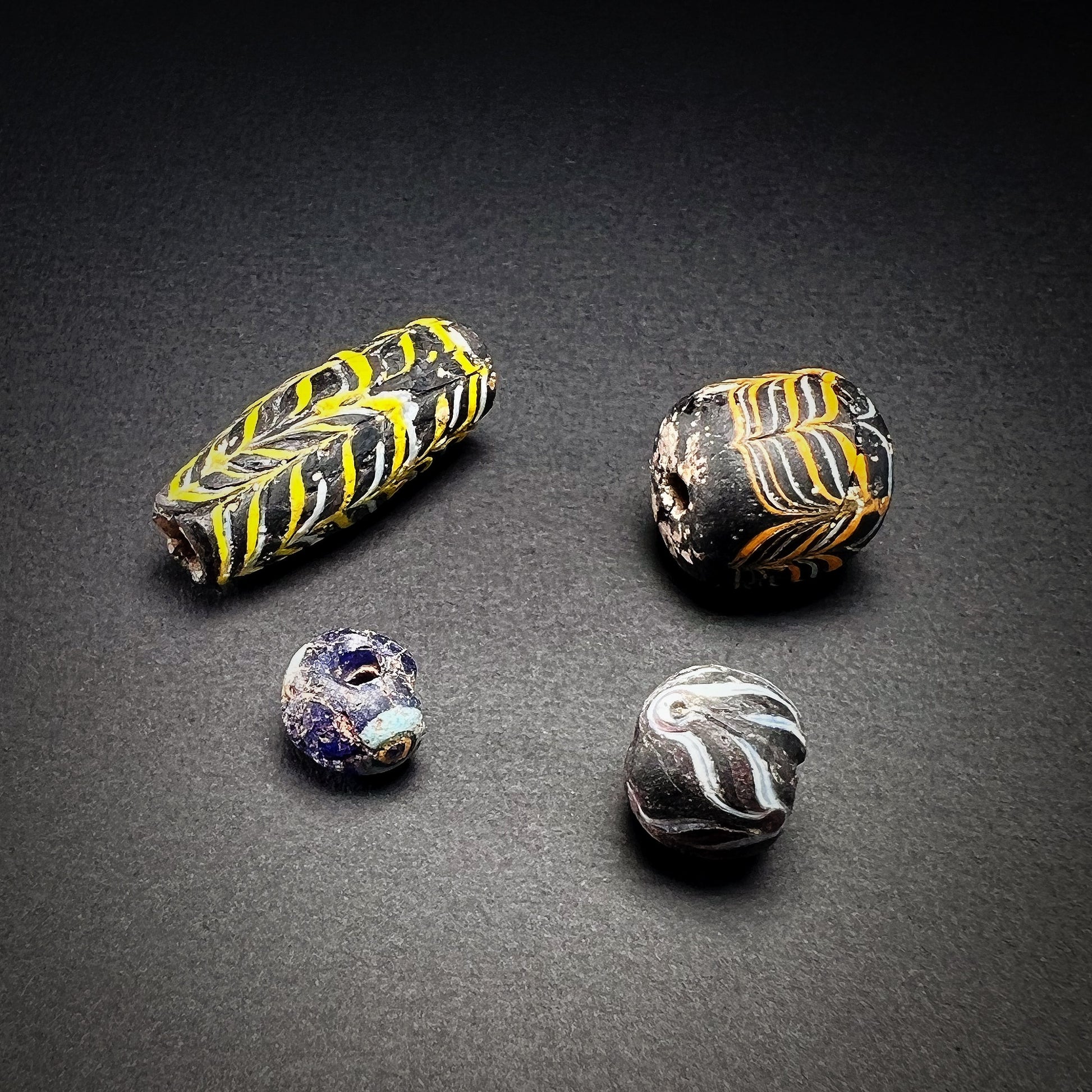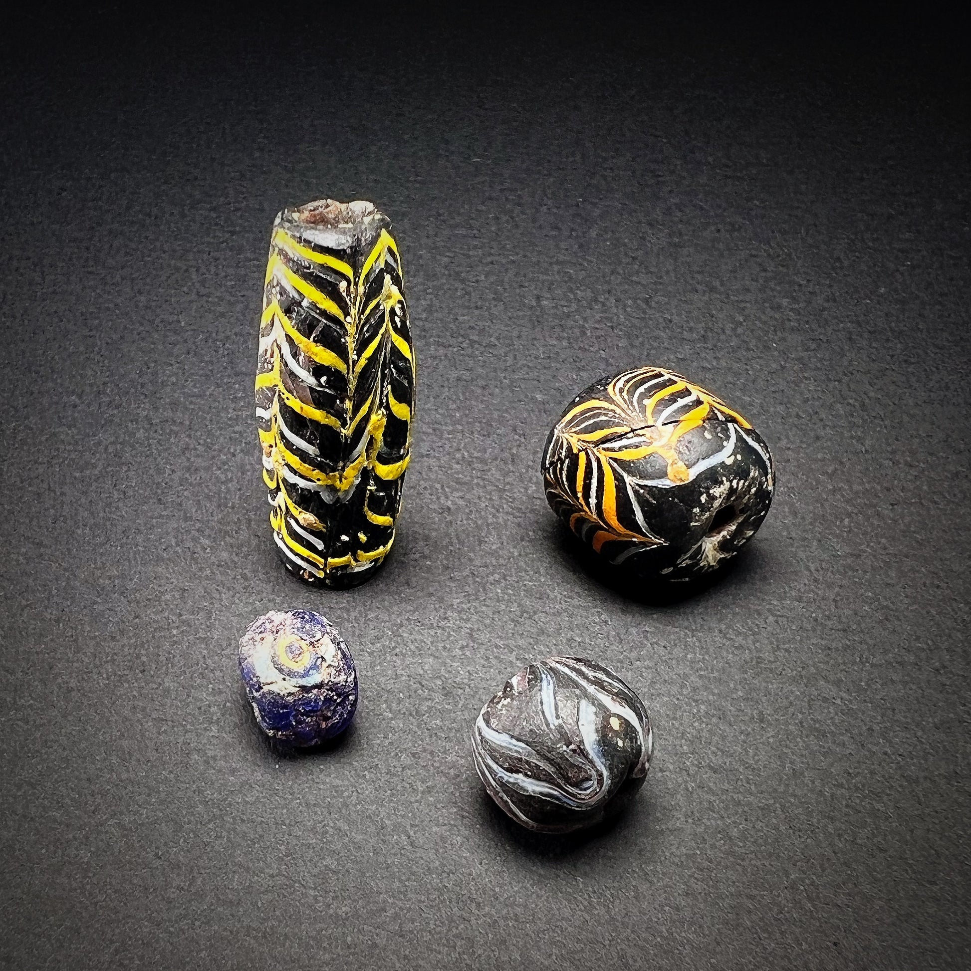 A beautiful set of four ancient Phoenician glass beads, each showcasing the artistry, symbolism, and far-reaching trade of the ancient Mediterranean world.