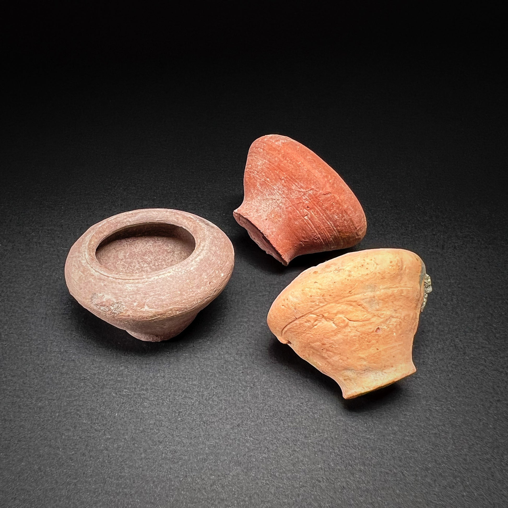 An exceptional trio of finely preserved Roman terracotta miniature vessels, each carefully wheel-thrown and beautifully proportioned, dating to the height of the Roman Empire. With their rounded, slightly compressed bodies, wide mouths, and delicately formed rims—originally designed to hold lids—these small vessels embody both the elegance and practicality of Roman ceramic artistry. Their gently tapering shoulders rise from subtly protruding flat bases, lending them stability as well as aesthetic refinement.