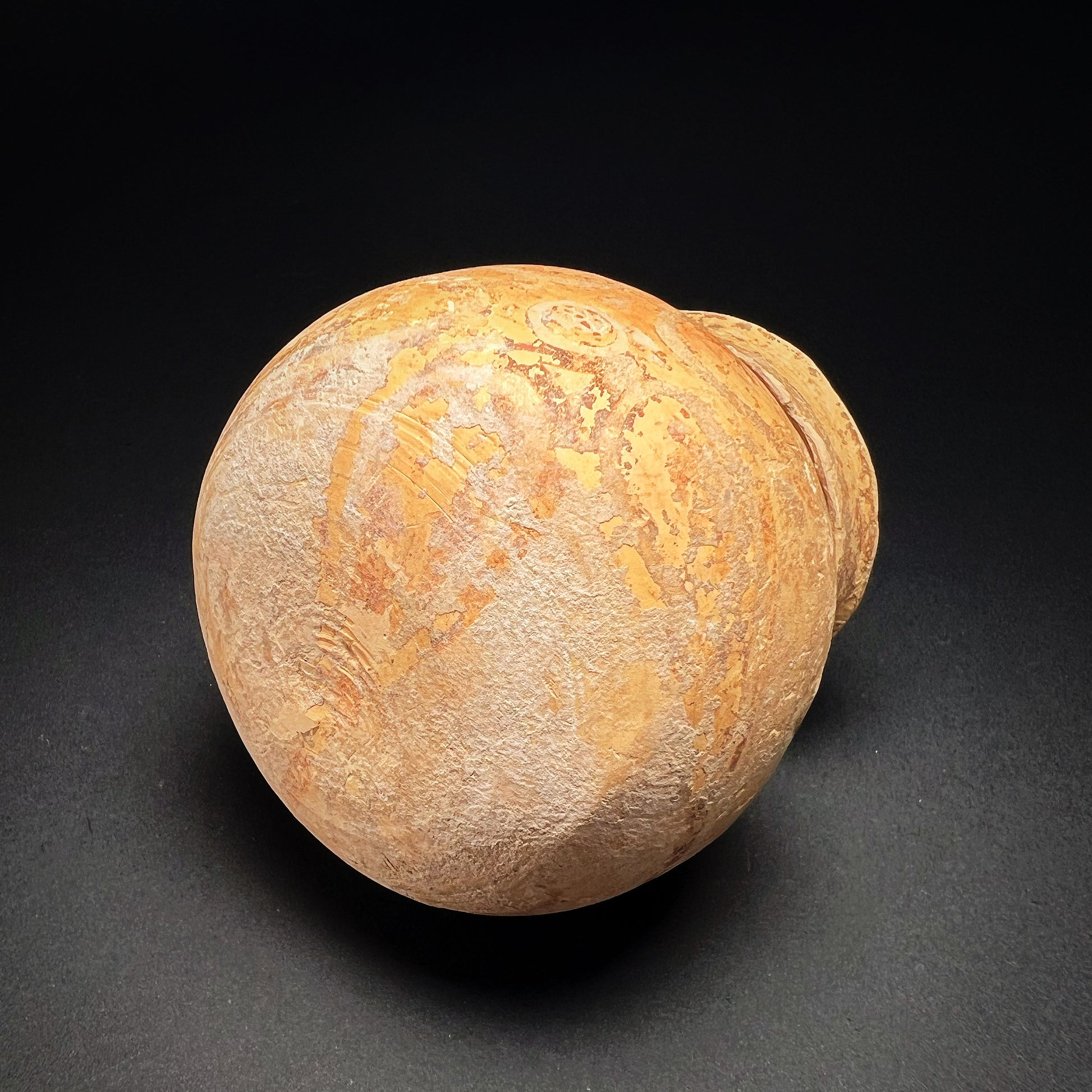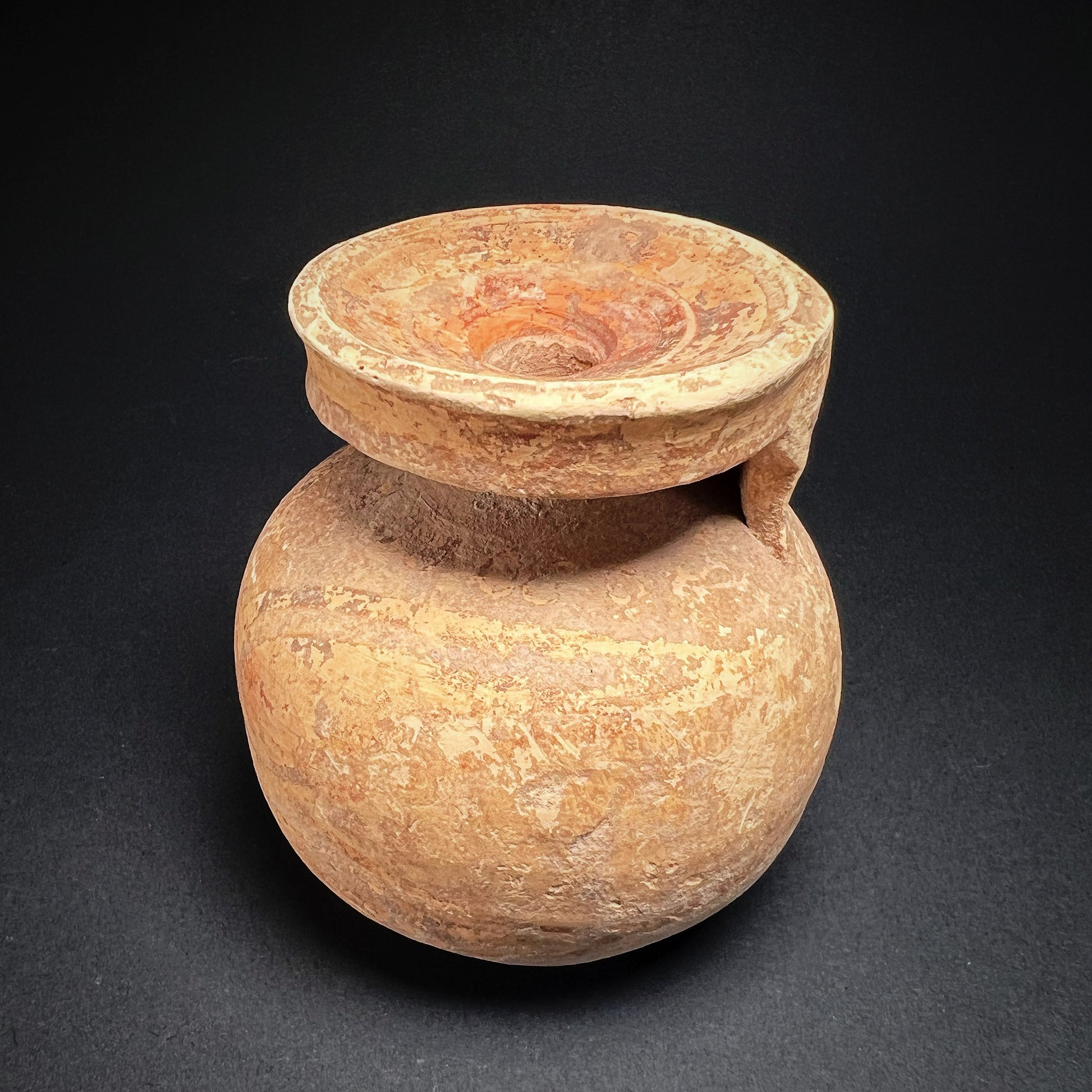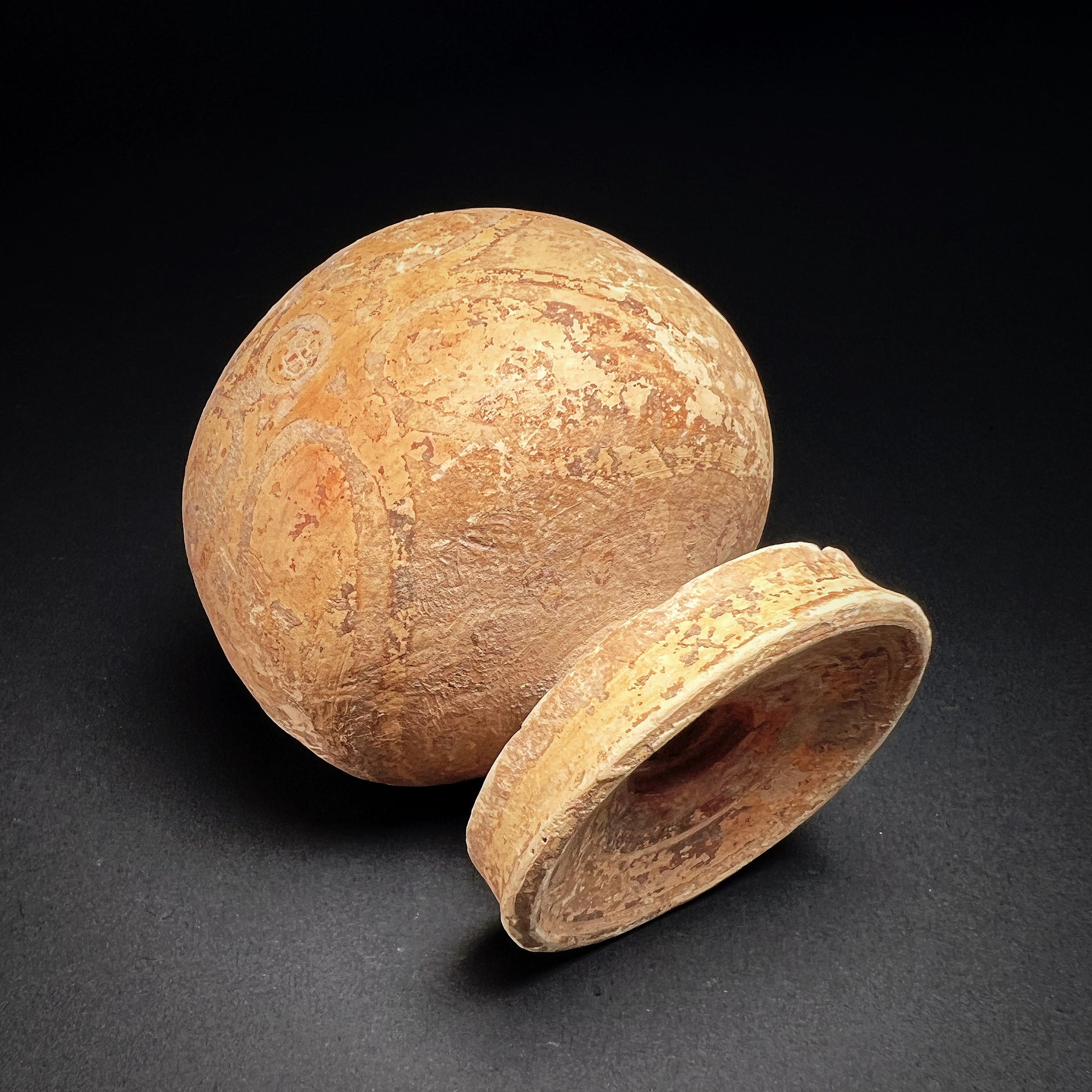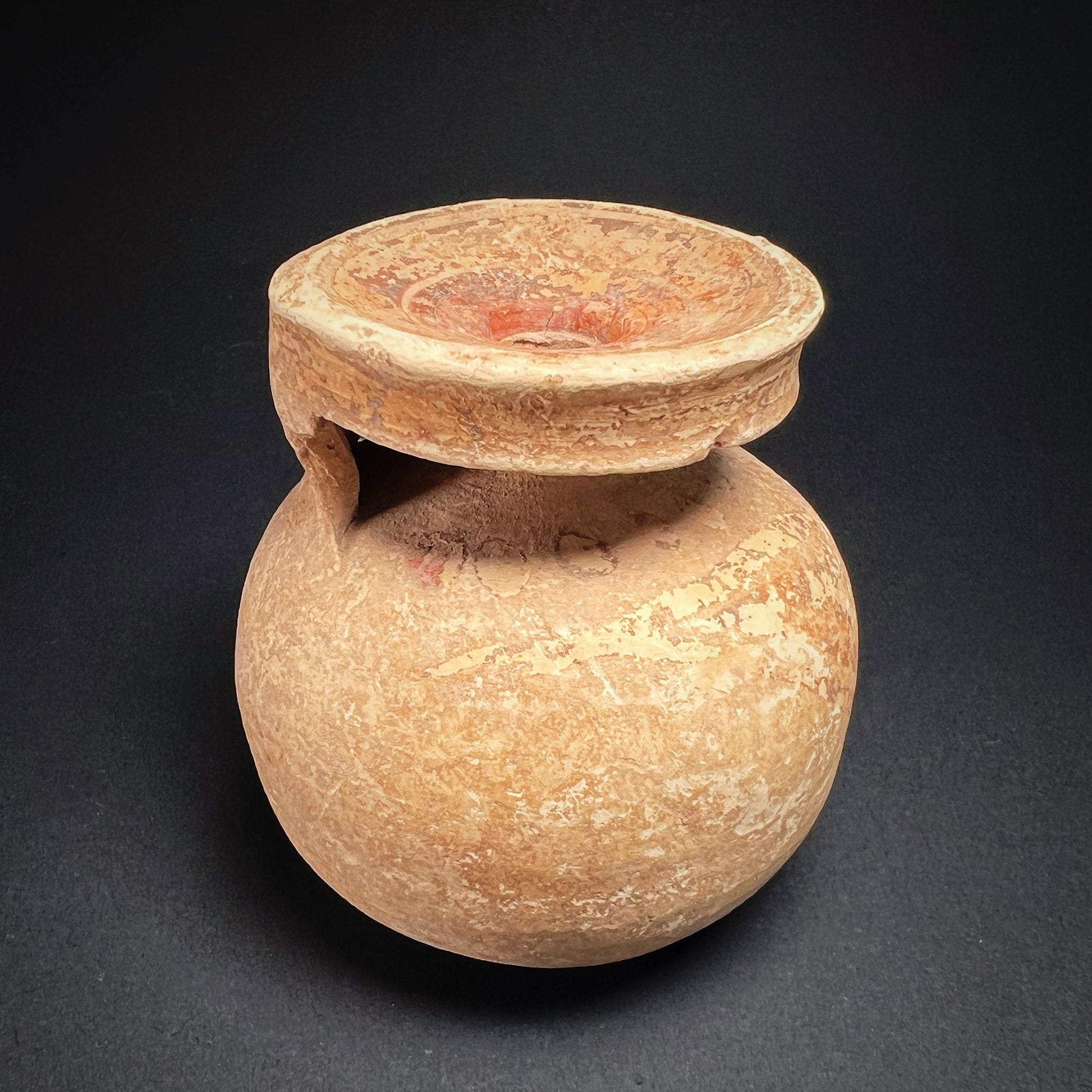 Good condition. Surface wear commensurate with age, with a few chips to the rim and encrusted patina and rich earthen deposits throughout. Size approx. 6,7cm x 6,5cm x 6,5cm.