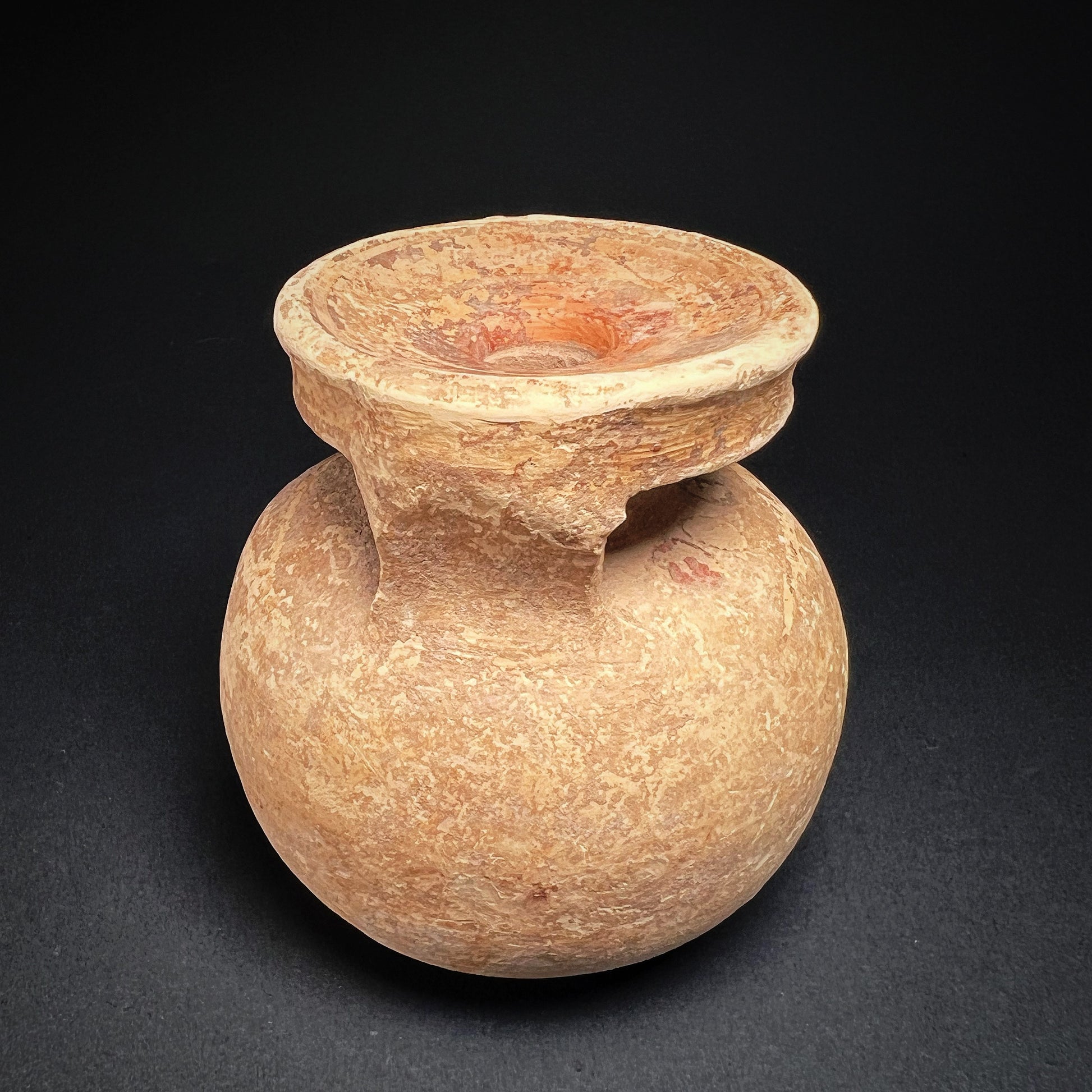 A superb wheel-thrown terracotta aryballos, finely crafted in a squat form with a rounded base, globular body, slender neck, and collared rim, joined by a single strap handle from rim to shoulder. Vessels of this type were used in daily life to hold perfumed oil or ointment, often carried by athletes and aristocrats alike.