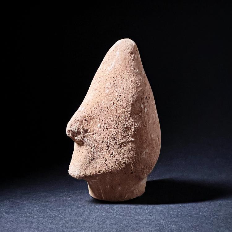 This fascinating terracotta fragment from the Cypro-Archaic period portrays a warrior figure, part of a horse and rider group. The male figure, crafted in the abstract style characteristic of Iron Age Cyprus, features a conical headdress or crested helmet, along with distinct facial traits—a protruding chin, beard, hooded eyes, small pellet-like ears (or helmet studs), and a prominent hooked nose.