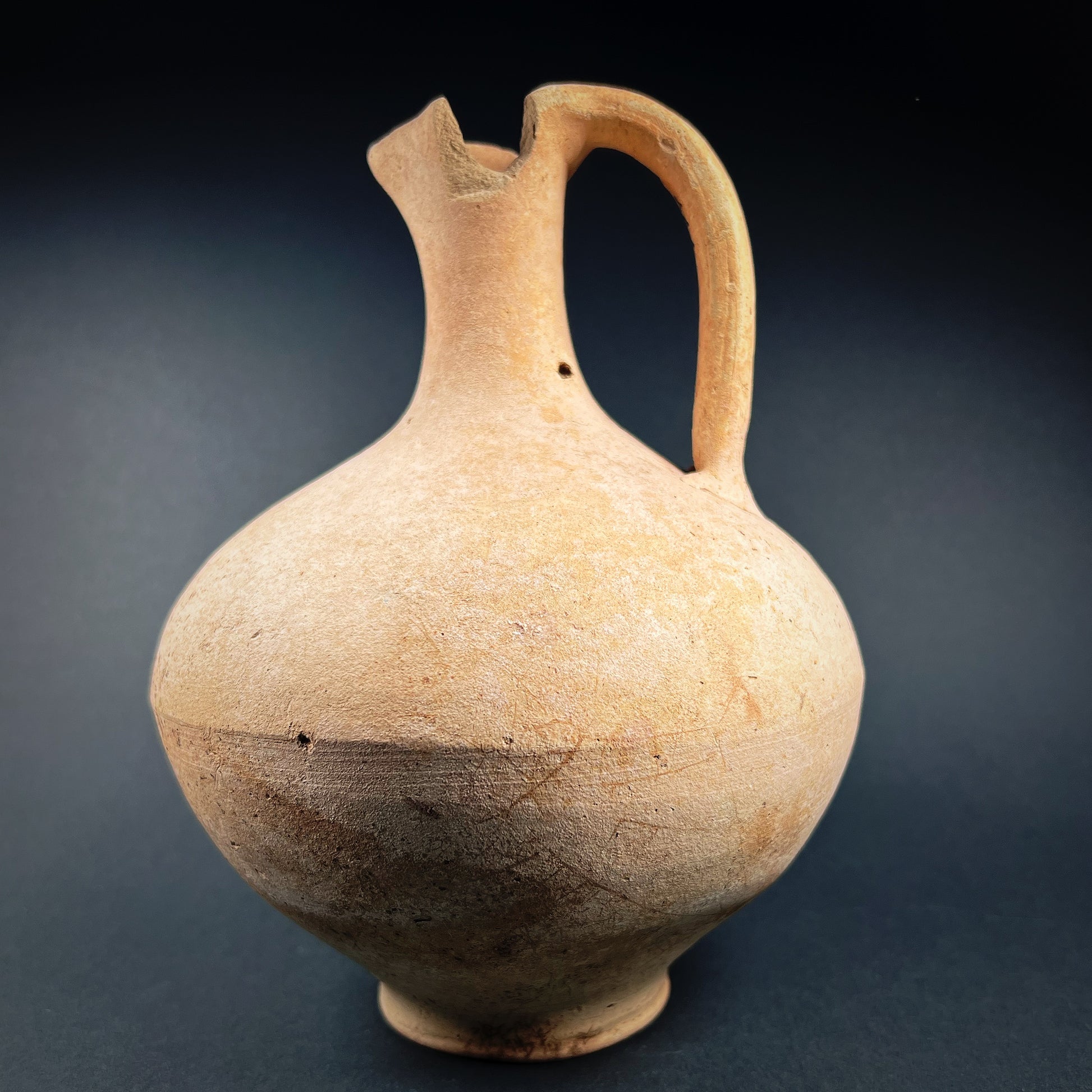 This exquisite wheel-made pottery wine jug, or oinochoe, crafted from Plain White Ware VI during the Cypro-Classical II period, is a superb example of the understated elegance and functionality that define ancient Cypriot ceramics. The vessel features a beautifully proportioned depressed ovoid body resting on a slightly raised disc base, a sinuous concave neck, and a refined trefoil-shaped lip designed for smooth pouring. A single strap handle gracefully extends from the rim to the vessel's waist, harmonizing the jug's form with its practical use. The piece is made from light buff clay with white grits, offering a tactile charm that reflects its ancient origins.