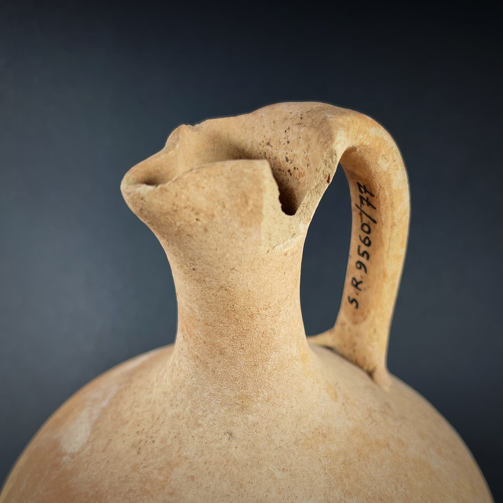 This wine jug is more than just an artifact of utility; it represents the harmonious blend of form, function, and cultural significance characteristic of ancient Cypriot craftsmanship. Its timeless design and historical importance make it a captivating addition to any collection of Mediterranean antiquities or archaeological treasures.