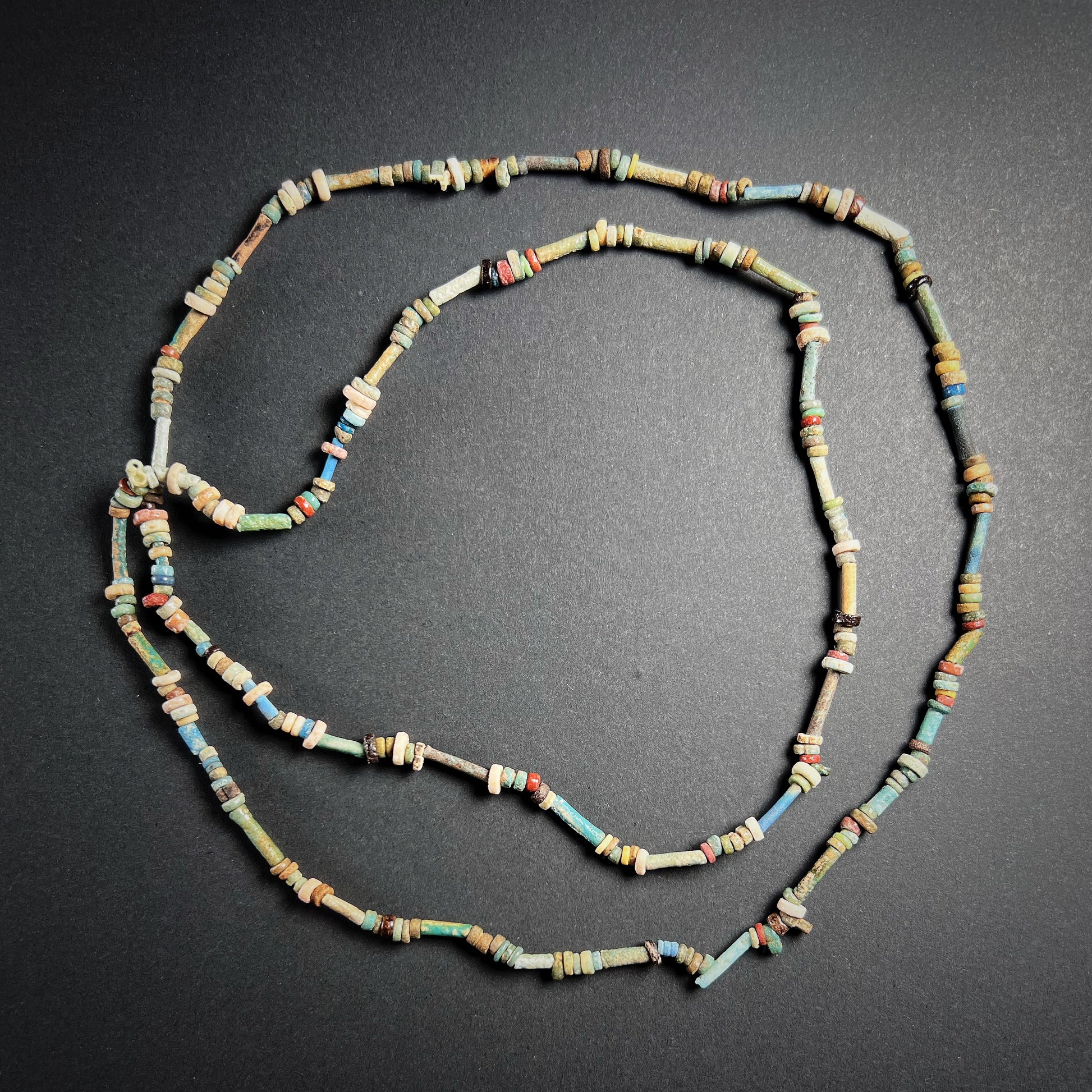 A beautiful and timeless ancient Egyptian necklace, carefully restrung for preservation, composed of faience beads arranged in a striking interplay of form and color. The necklace features long turquoise tubular beads, interspaced with smaller disc-shaped spacers in red, black, blue, brown, and white. This rhythmic sequence reflects the refined aesthetics of Egyptian jewelry-making, where harmony, balance, and symbolism were central to design.