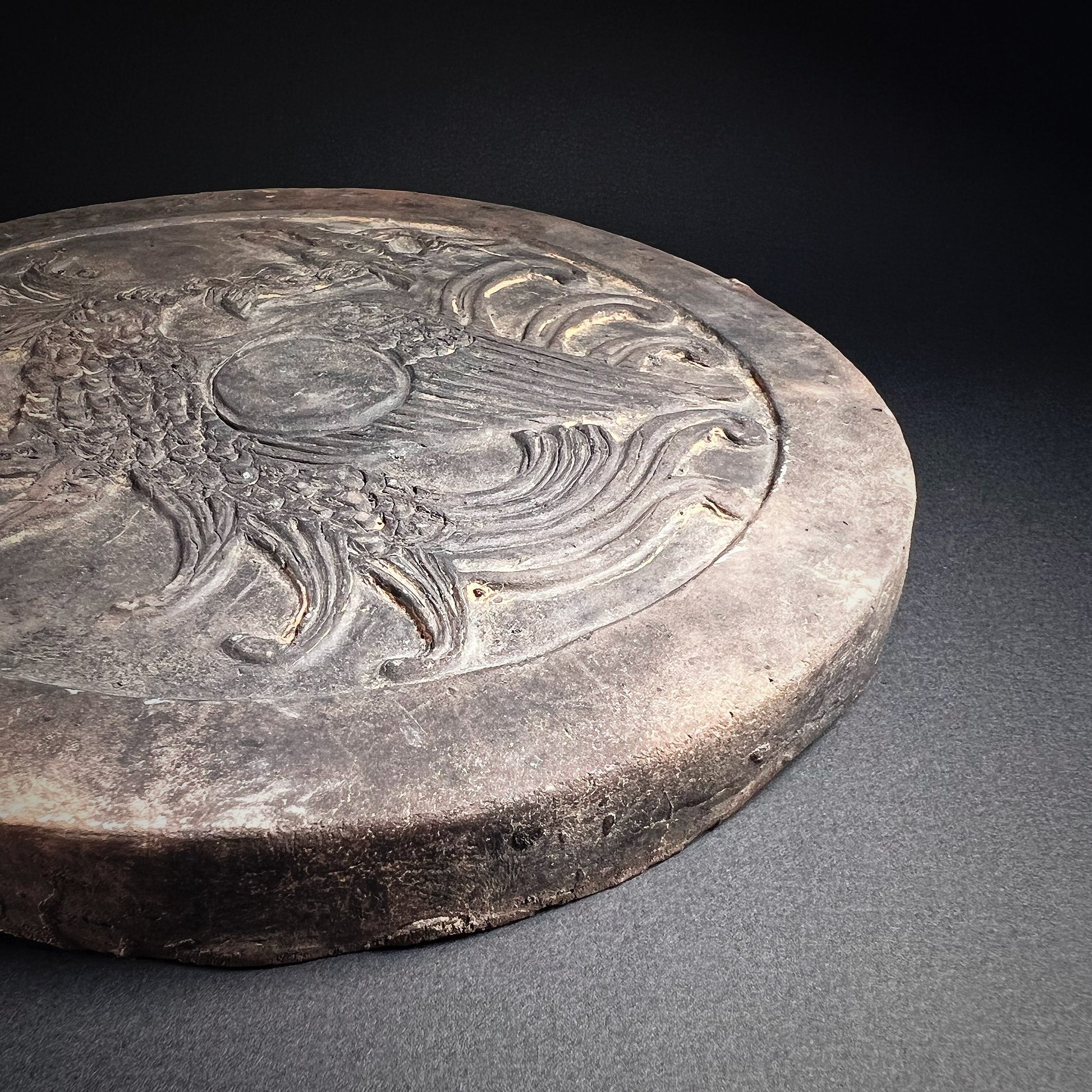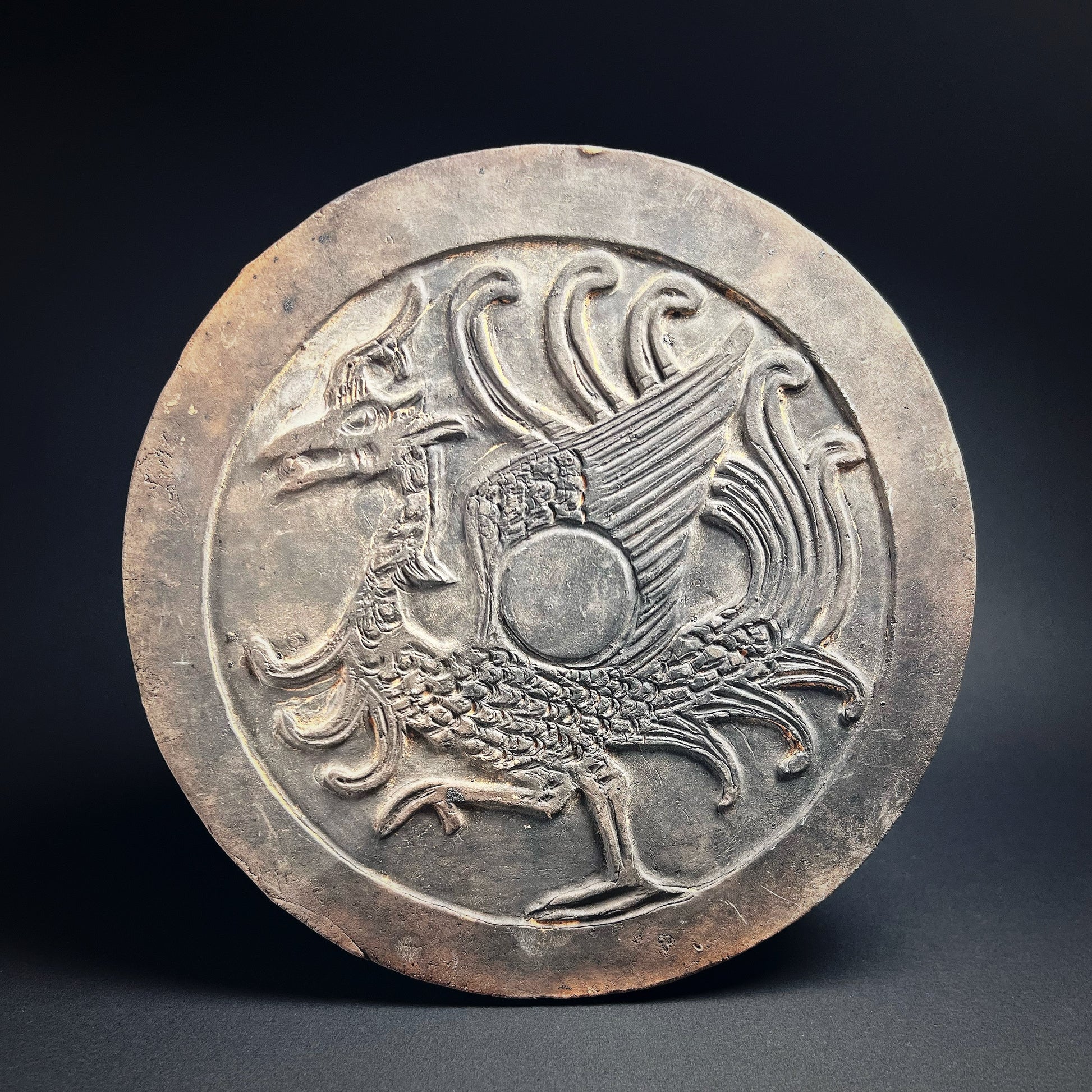 A fascinating circular pottery roof tile fragment, finely molded with a depiction of the Red Bird (Zhuque)—an enduring emblem of vitality, protection, and auspicious power in ancient China. Possibly dating to the Han period, this fragment exemplifies the artistic and architectural sophistication achieved during one of China’s most illustrious dynasties.