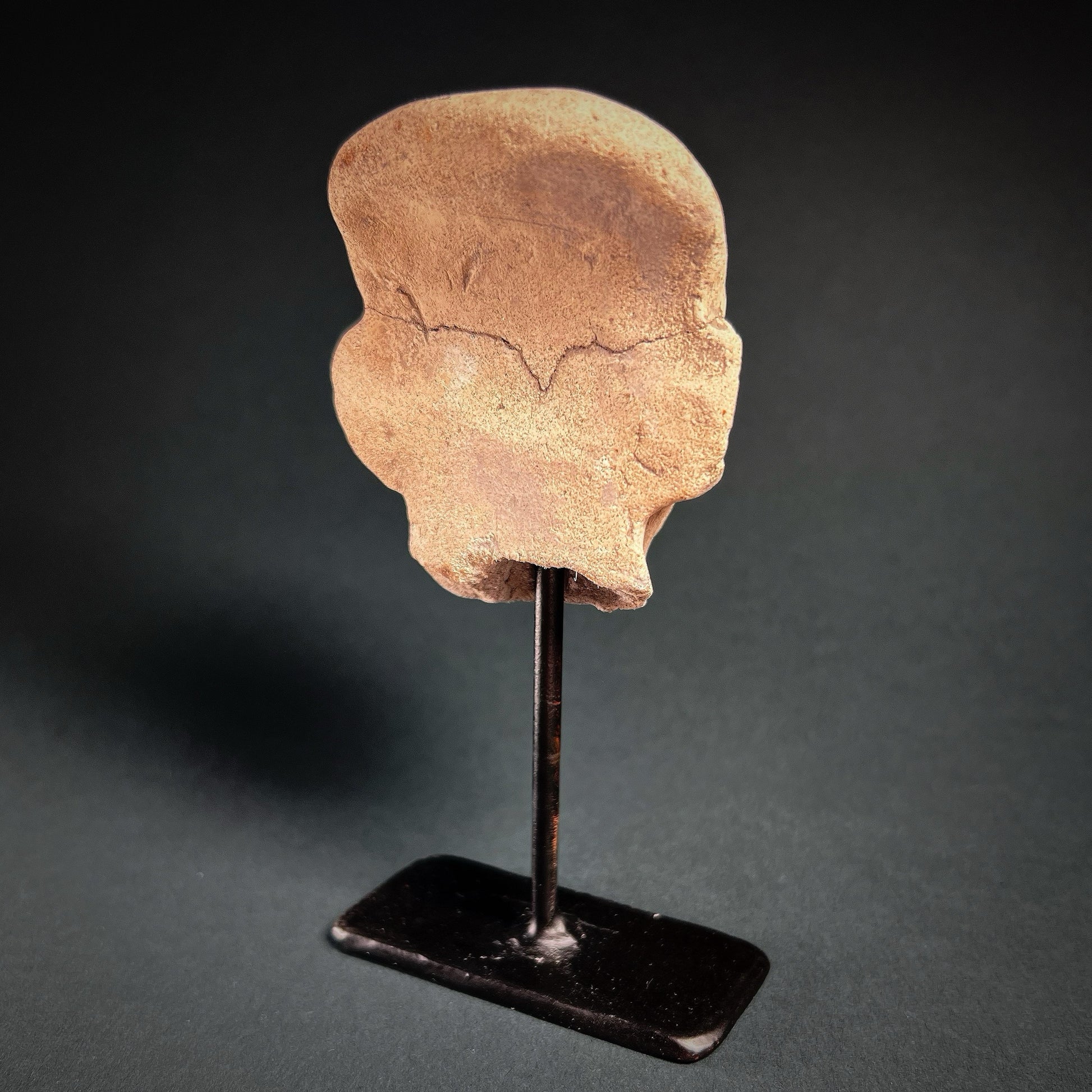 Good condition. Surface wear and abrasions commensurate with age, nicks and chip, with fading to some finer features, and light encrustations within recessed areas. Nice earthen deposits throughout. Size approx. 6,8cm x 5,7cm x 3,8cm on included custom stand.