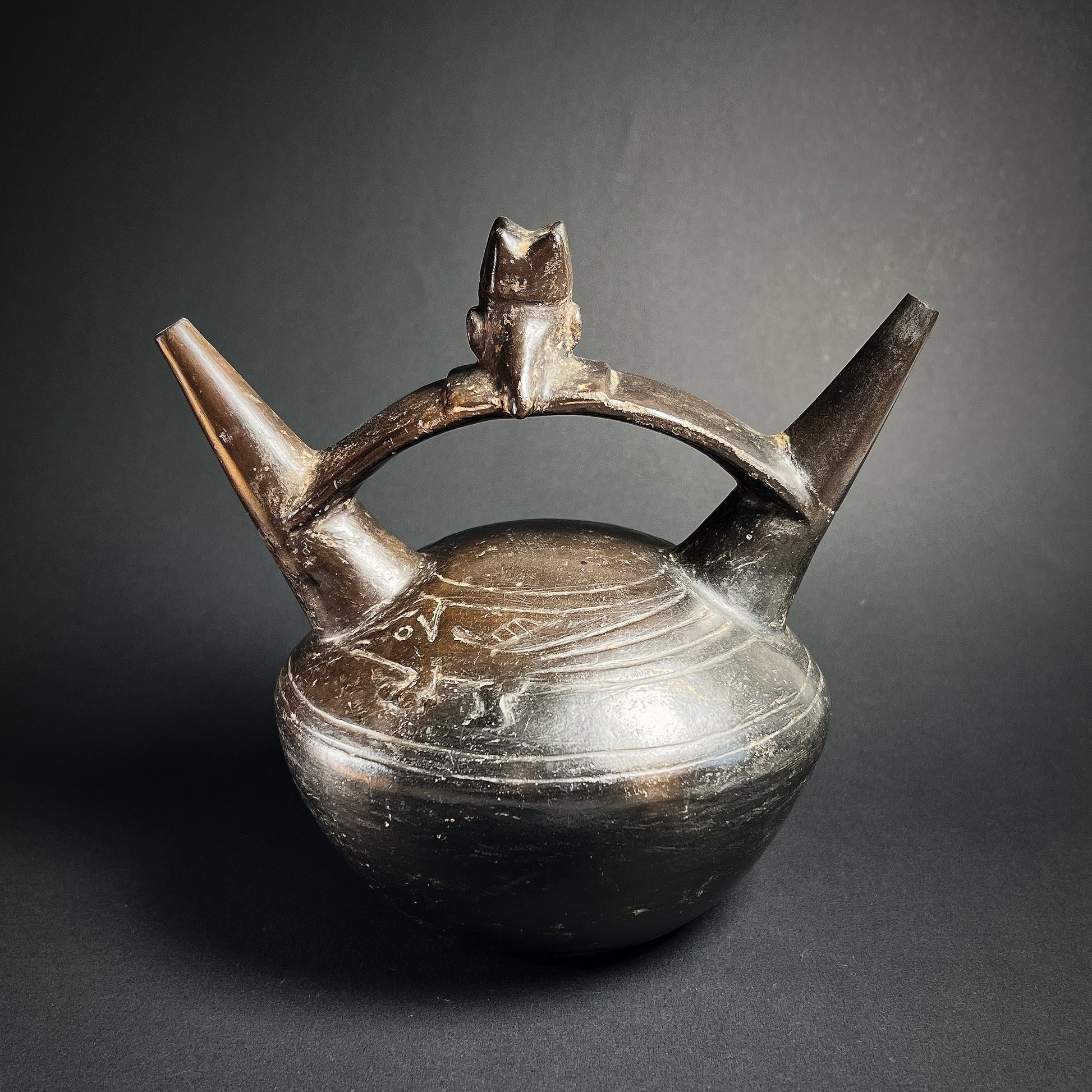 An absolutely fascinating and elegant Lambayeque (Sicán) blackware pottery vessel, mold-made with a rounded, tapering body set upon a flat base. Rising from the shoulders, two tall, slender spouts are joined by an arched bridge handle, dramatically surmounted by an imposing human head—possibly representing Naylamp, the legendary founder of the Sicán dynasty. The visage is sculpted with striking detail: raised almond-shaped eyes, a prominent nose, thin lips, pointed chin, and realistic ears, all crowned by an elaborate projecting headdress.
