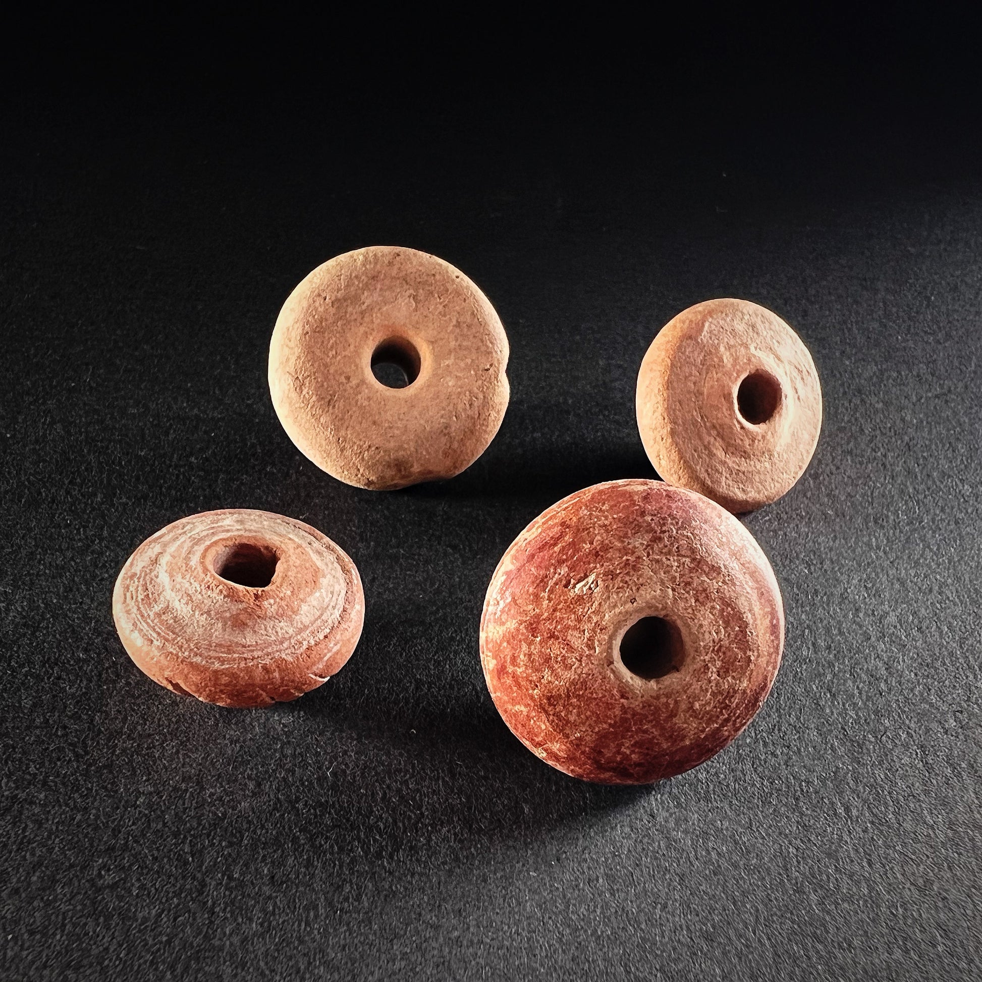An exceptional and highly attractive group of four Pre-Columbian earthenware spindle whorls, each meticulously decorated with finely incised linear and circular motifs of remarkable precision. Carefully shaped and hand-polished, these refined objects are compelling survivals from the sophisticated textile traditions of ancient South American civilizations.