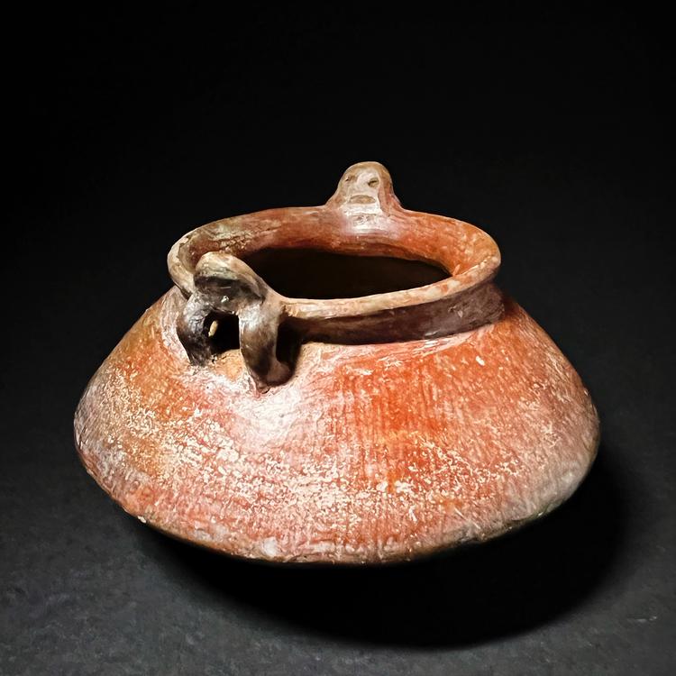 An absolutely gorgeous small-sized redware olla, expertly crafted with a saucer-shaped body, wide mouth, and flared lip. The handles, elegantly sculpted into the forms of two mythical creatures, add a striking symbolic and artistic dimension to the piece.