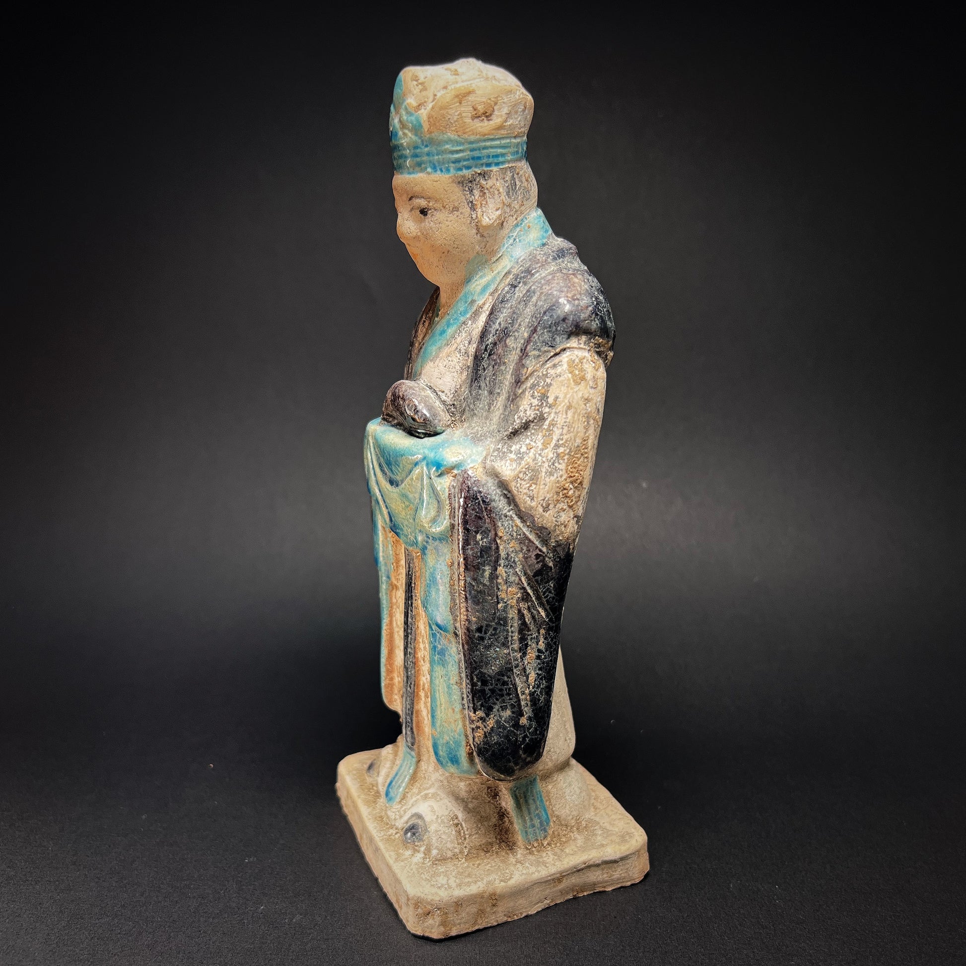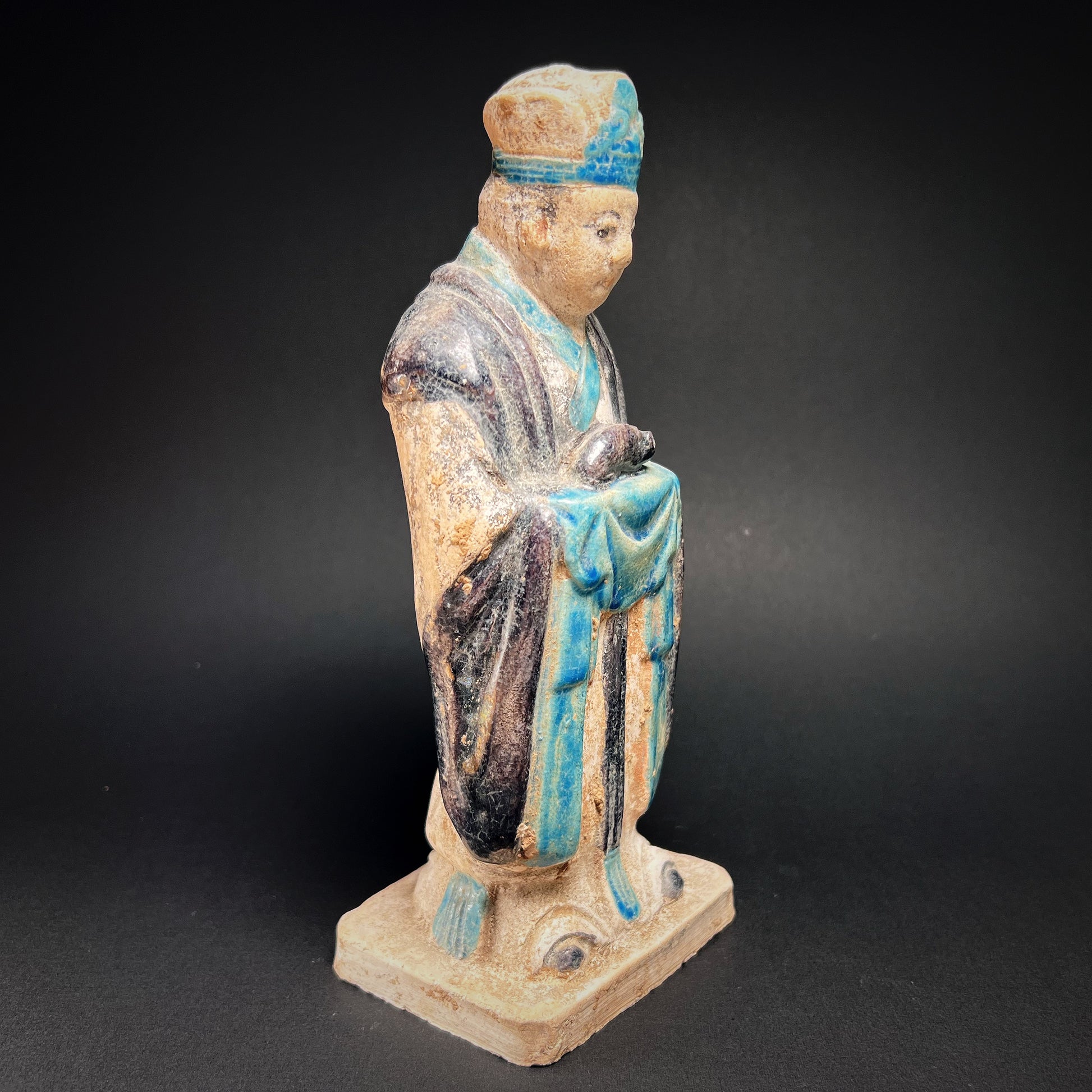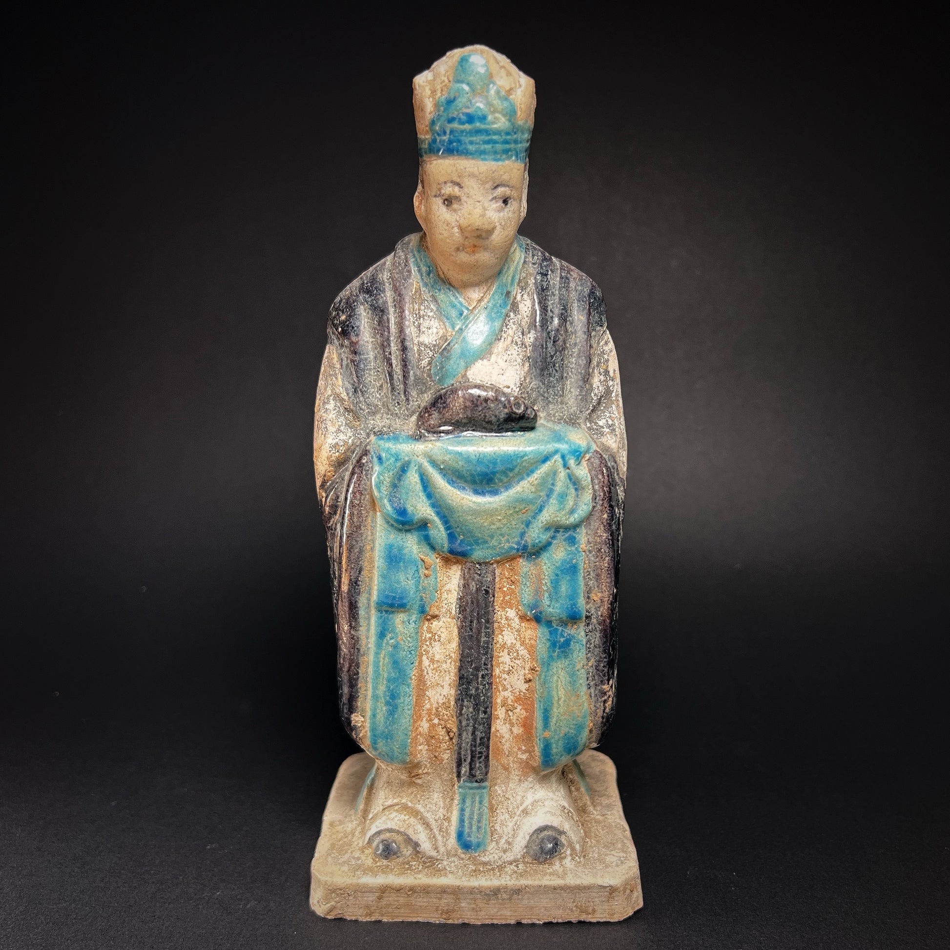 This exceptional Ming Dynasty tomb figure represents an attendant holding a rat, one of the twelve animals of the Chinese zodiac. Hand-molded in terracotta, the figure is richly adorned with a long flowing robe decorated in turquoise and black glazes, applied with remarkable precision. Much of this original coloration has survived, a testament to the technical mastery and enduring artistry of Ming potters.