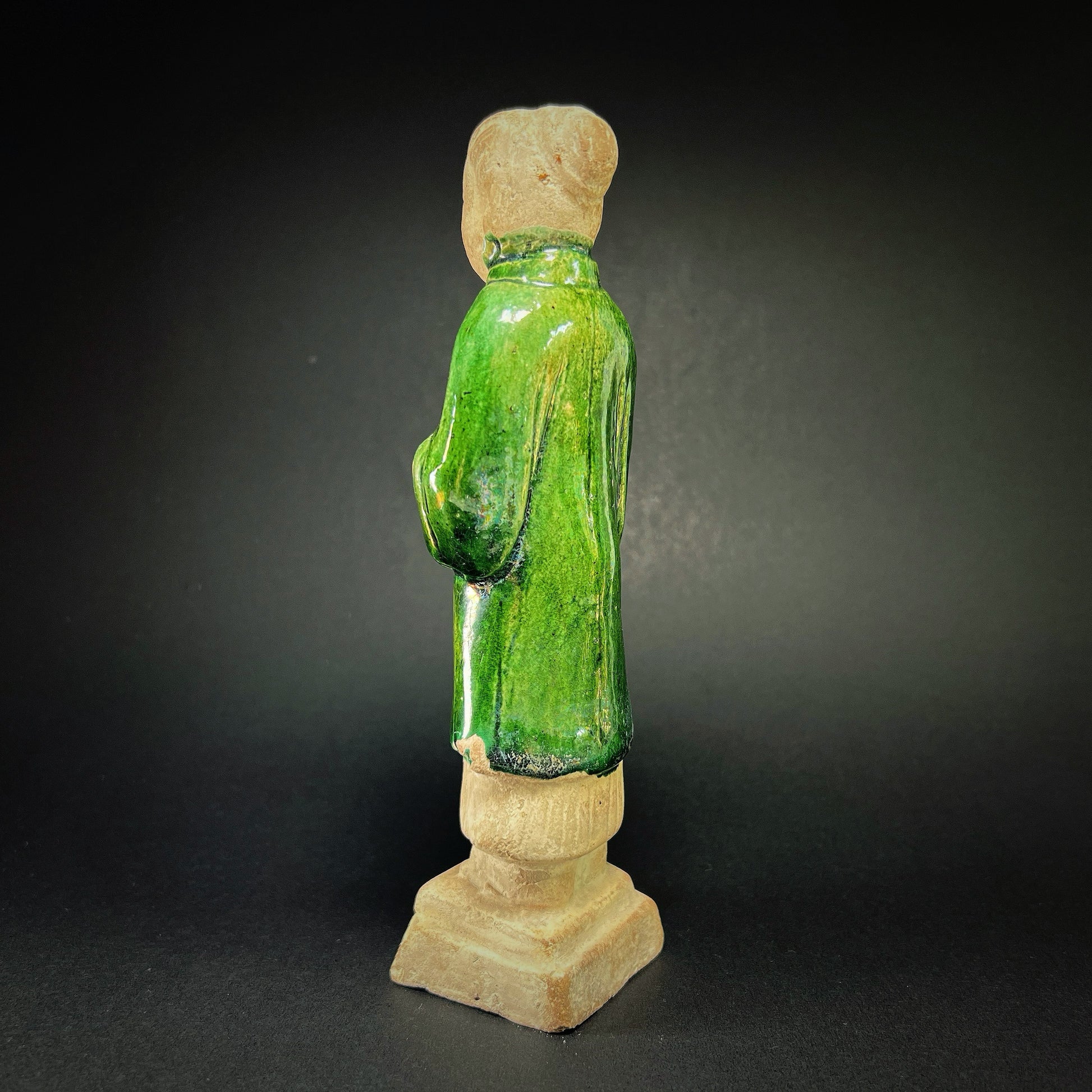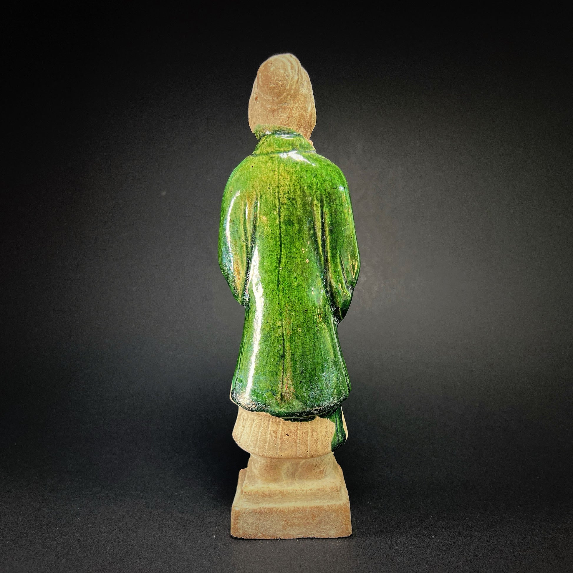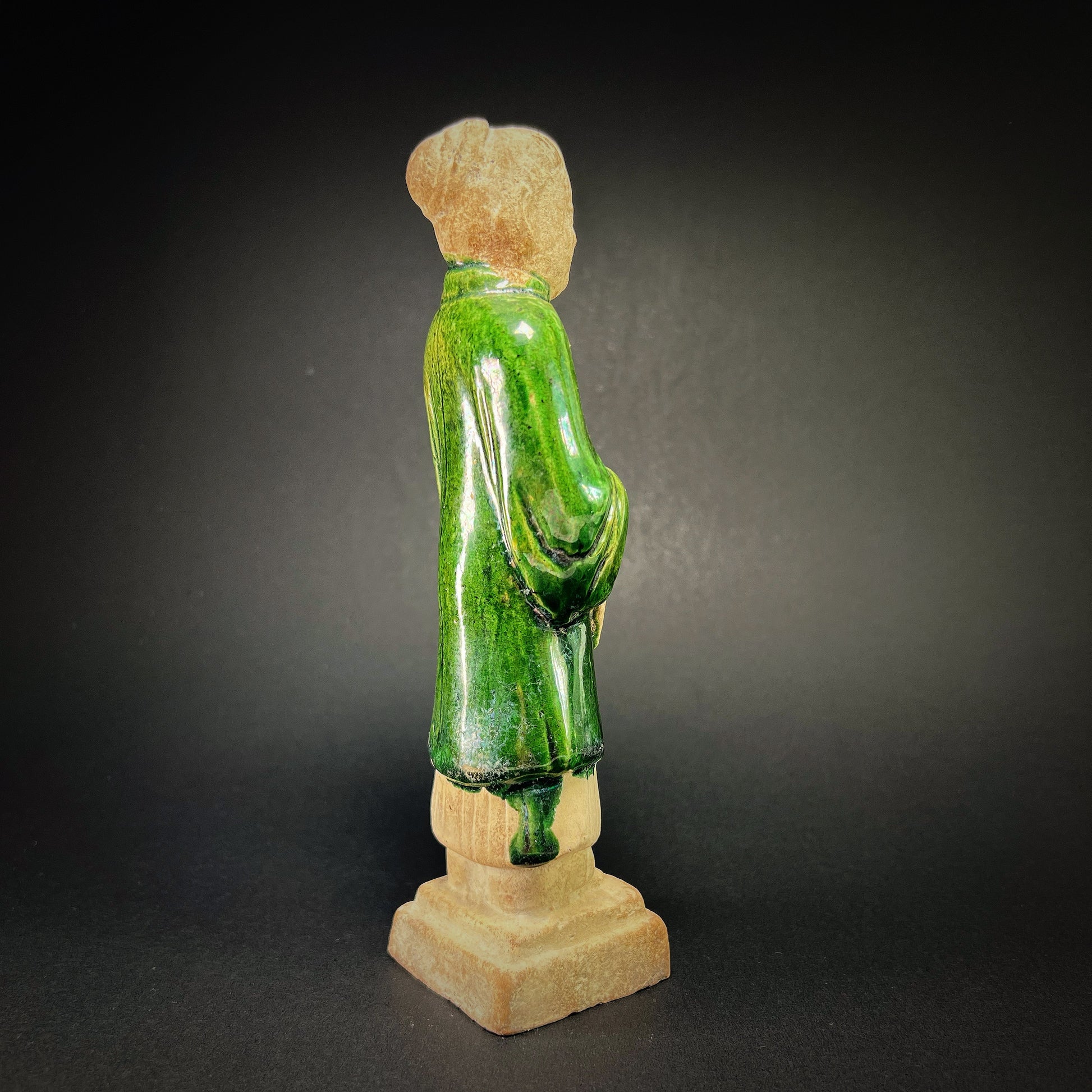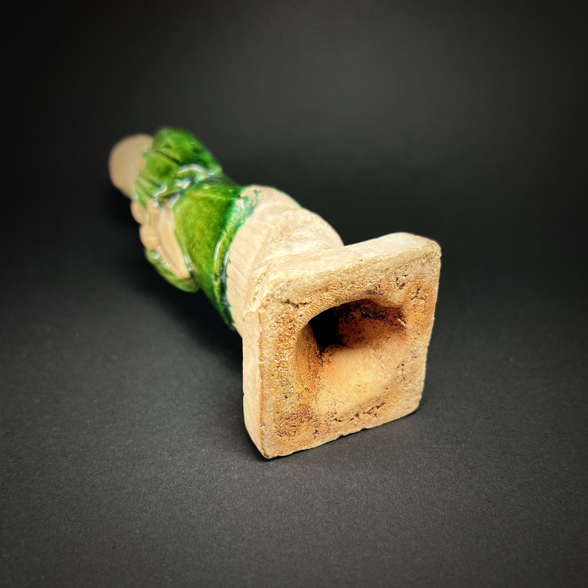 The striking green glaze, a hallmark of Ming funerary wares, enhances the figure’s elegance and imbues it with both vibrancy and spiritual resonance. Together with the finely sculpted details of her attire and serene facial features, this figure exemplifies the technical mastery and aesthetic sophistication of Ming mortuary art.