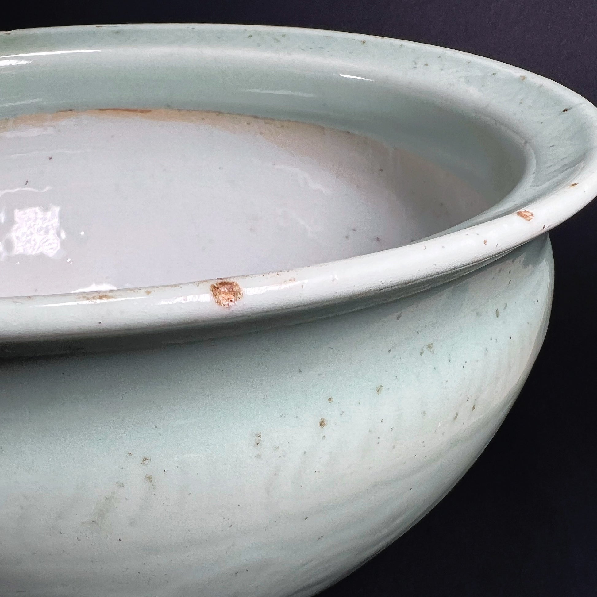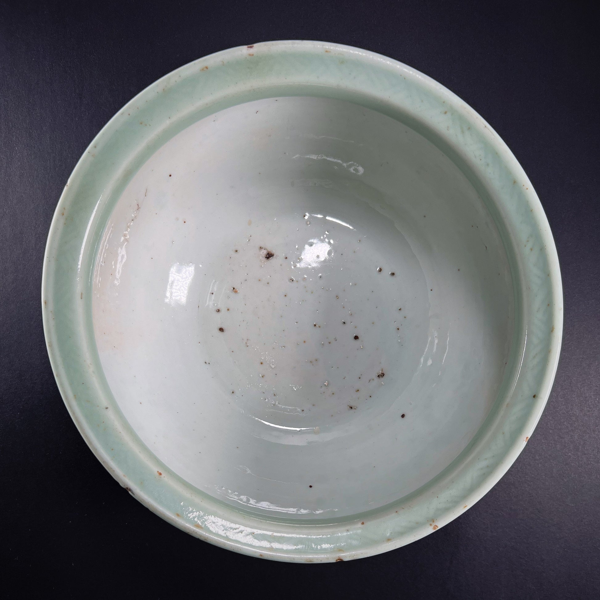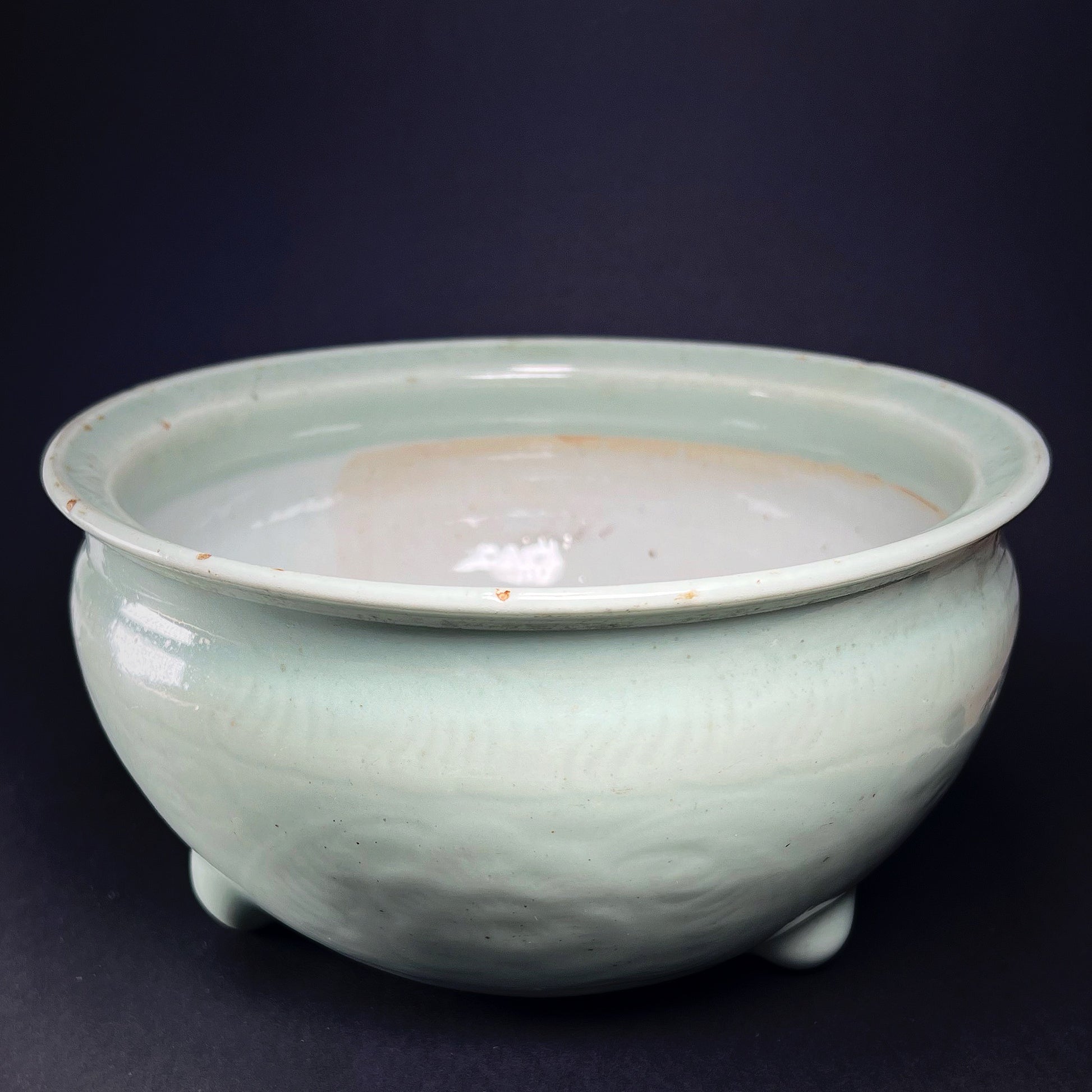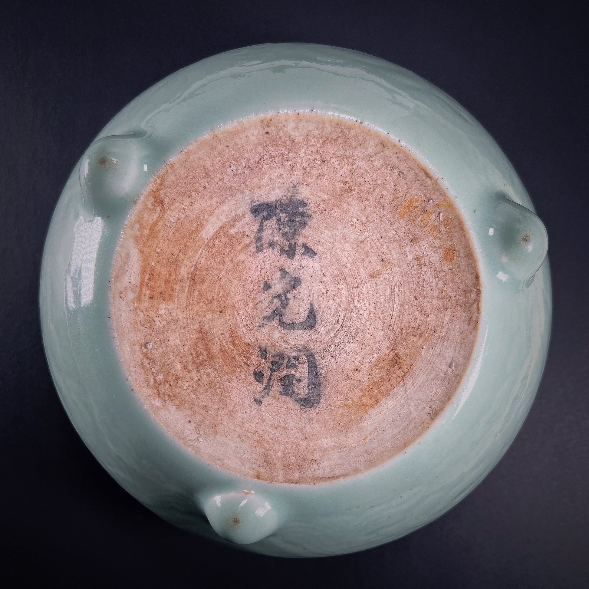 Heavy-built celadon censer is beautifully potted of a round globular body supported on three short knob feet. A large censer is surmounted by an everted rim and delicate carved light relief with blossoming peony foliage. It is covered outside with a glaze of pale sea-green tone, in places suffused with minute bubbles. Interior with lighter green shade glaze. The unglazed exterior base signed with Chinese characters. Excellent condition. Firing cracks and glazing flaws, such as dark spots. Glaze flakes an recesses. Minimal abrasion. Size approx. 23,3cm x 23,3cm x 12,5cm.