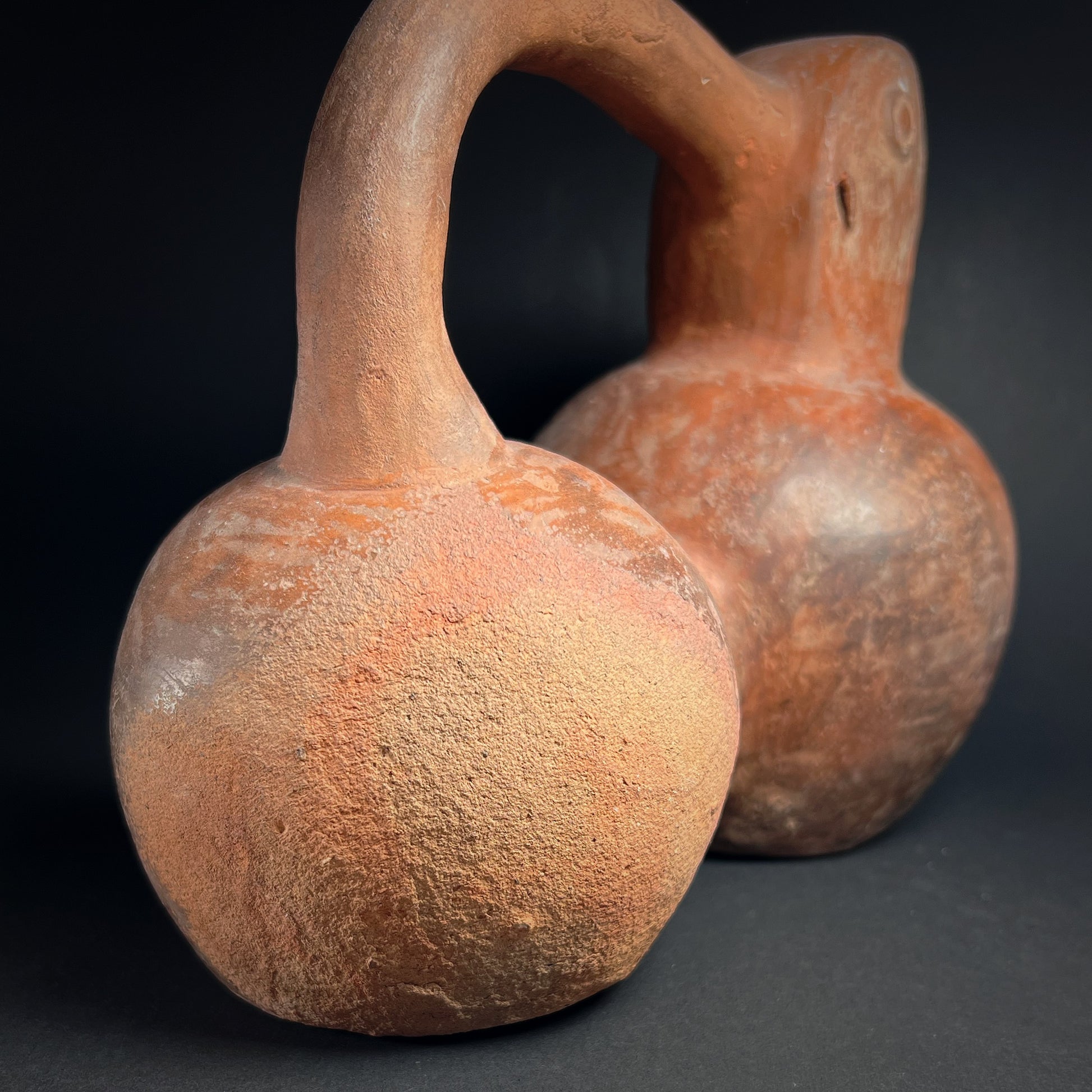 This bottle is a rare and compelling survival, notable not only for its unusual sculptural form and fine artistry, but also for its powerful symbolic iconography. Parrots were, and remain, highly revered in ancient South American belief systems. Their brilliant plumage and ability to soar above the forest canopy made them ideal manifestations of sky and celestial deities. Parrots in particular were believed to possess supernatural qualities, likely of divine or cosmic origin, and their feathers—traded from the Amazon—were reserved for royal and elite regalia.