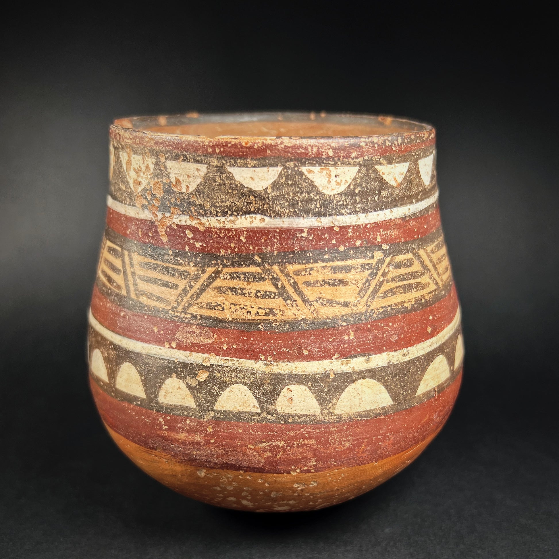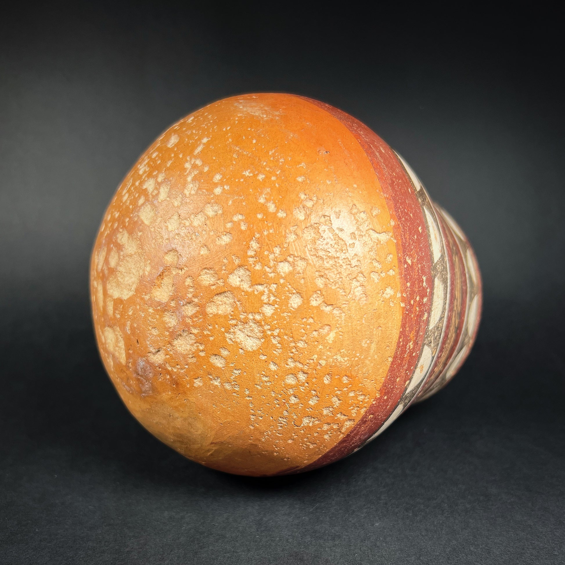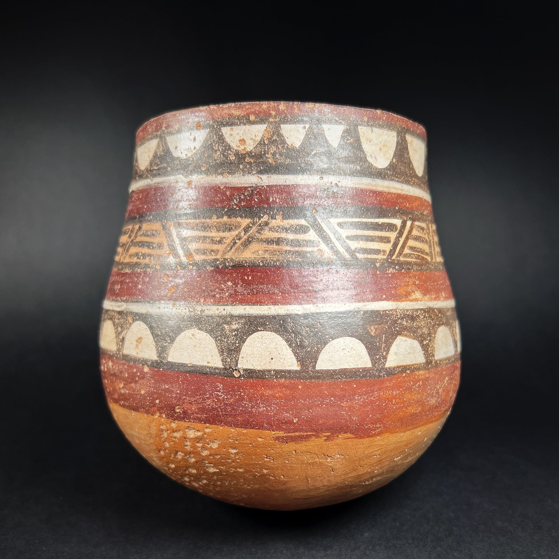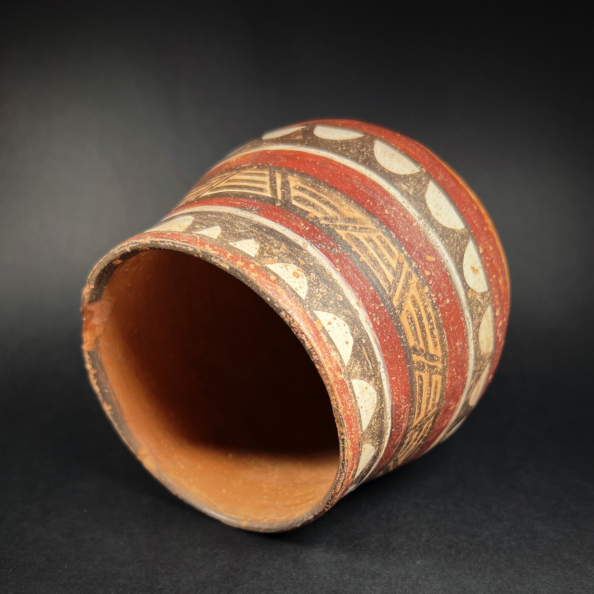 This breathtaking hand-built Nazca pottery waisted beaker is a true collector’s treasure, showcasing the exceptional artistry of the Nazca civilization (300 BC – 600 AD). With its elegantly tapered, steep walls and convex base, this beaker is adorned with mesmerizing geometric patterns in red-brown, black and white, divided into three distinct abstract zones. The intricate designs are separated by thin white bands, creating a striking visual harmony that reflects the sophistication of Nazca craftsmanship.