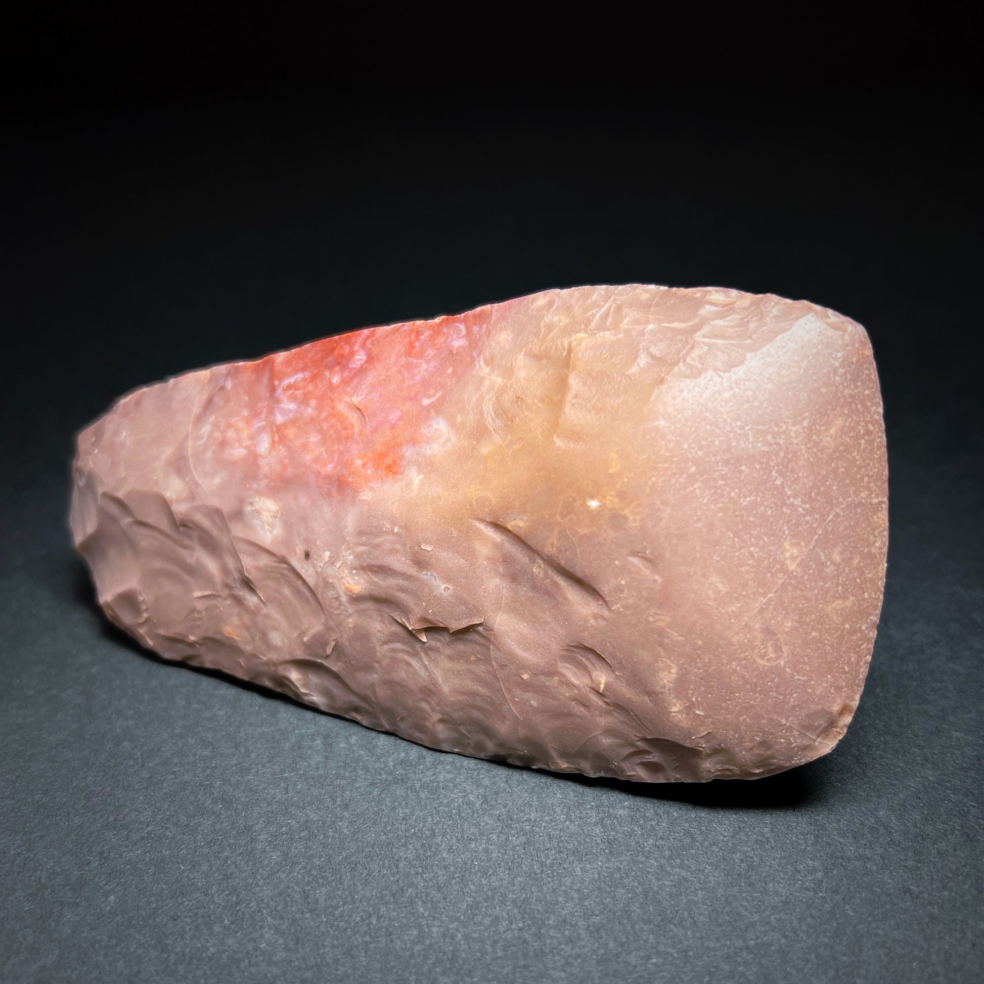Magnificent large African Neolithic Capsian culture knapped flint celt axe exhibiting beautiful colours of red and grayish brown throughout the flint. The polished surface along the blade and faces was a technological advancement of Neolithic cultures - polishing the flaked stone made it easier to cut trees and cultivate the land. This type axe would have been inserted into a wooden handle and further lashed in place to secure it to the shaft. Similar to the European Neolithic celt axes, the African Neolithic celt axes were either completely flaked or made by grinding a blank and finishing by knapping. The Capsian culture was a Mesolithic and Neolithic culture centered in the eastern Maghreb (eastern Algeria and west-central Tunisia) that lasted from about 8000 to 2700 BC. It was defined in 1909 with the excavation of the site of El-Mekta, located near Gafsa, which was known as Capsa in Roman times. During this period, the environment of the Maghreb was open savanna, much like modern East Africa, with Mediterranean forests at higher altitudes where the initial phase overlaps with the African humid period. Hunting and snail-collecting seem to have formed the basis of the economy. The Capsian diet included a wide variety of animals, ranging from aurochs and hartebeest to hares, there is little evidence concerning plants eaten. Nothing is known about Capsian religion, but their burial methods suggest a belief in an afterlife. Decorative art is widely found at their sites, including figurative and abstract rock art, and ochre is found coloring both tools and corpses. Ostrich eggshells were used to make beads and containers; seashells were used for necklaces.