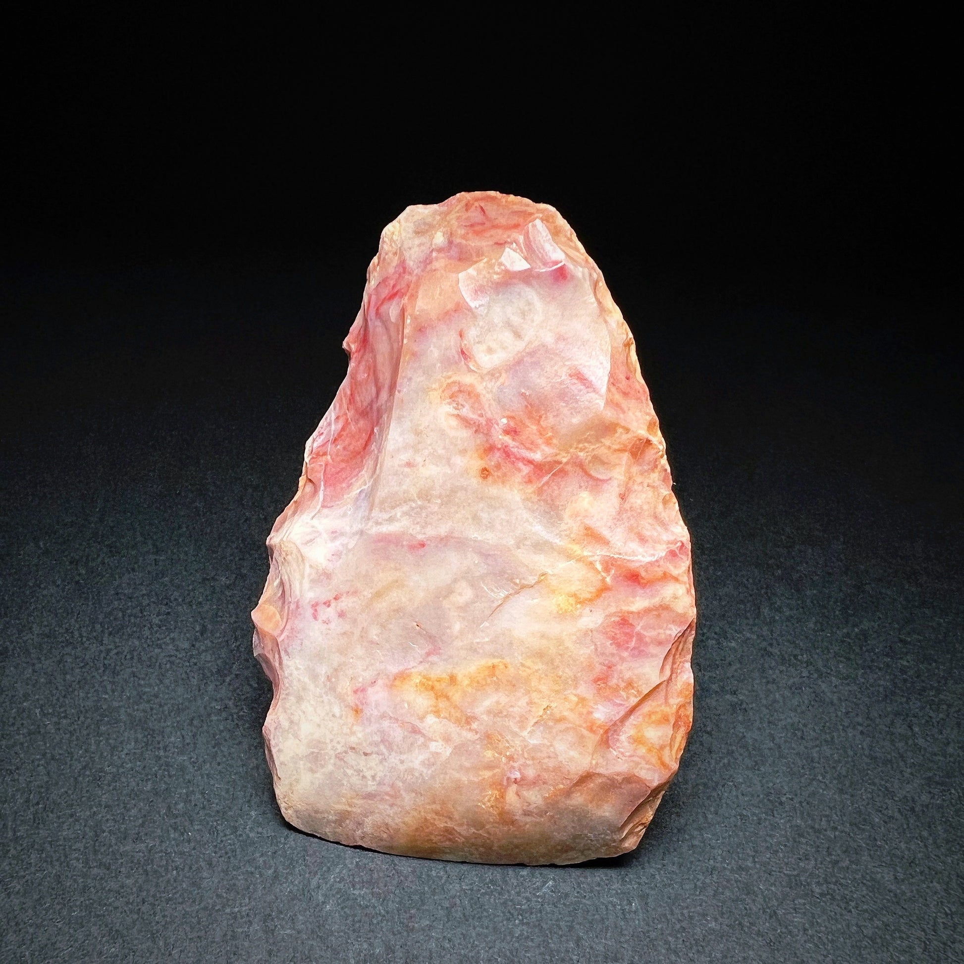 Superb African Neolithic Capsian culture knapped flint celt axe exhibiting beautiful colours of red and white throughout the flint. The polished surface along the blade and faces was a technological advancement of Neolithic cultures - polishing the flaked stone made it easier to cut trees and cultivate the land. This type axe would have been inserted into a wooden handle and further lashed in place to secure it to the shaft. Similar to the European Neolithic celt axes, the African Neolithic celt axes were either completely flaked or made by grinding a blank and finishing by knapping. The Capsian culture was a Mesolithic and Neolithic culture centered in the eastern Maghreb (eastern Algeria and west-central Tunisia) that lasted from about 8000 to 2700 BC. It was defined in 1909 with the excavation of the site of El-Mekta, located near Gafsa, which was known as Capsa in Roman times. During this period, the environment of the Maghreb was open savanna, much like modern East Africa, with Mediterranean forests at higher altitudes where the initial phase overlaps with the African humid period. Hunting and snail-collecting seem to have formed the basis of the economy. The Capsian diet included a wide variety of animals, ranging from aurochs and hartebeest to hares, there is little evidence concerning plants eaten. Nothing is known about Capsian religion, but their burial methods suggest a belief in an afterlife. Decorative art is widely found at their sites, including figurative and abstract rock art, and ochre is found coloring both tools and corpses. Ostrich eggshells were used to make beads and containers; seashells were used for necklaces.
