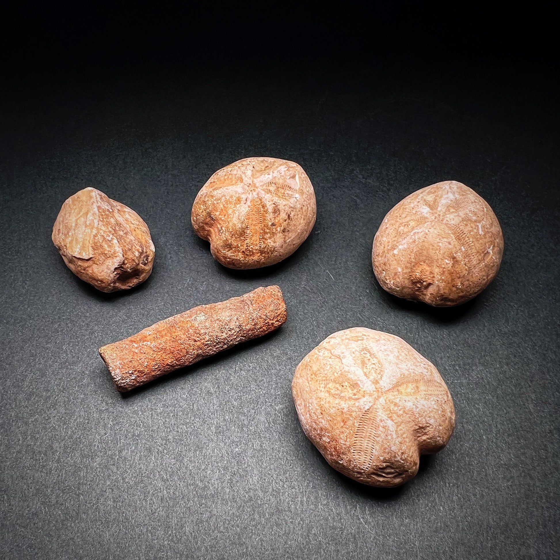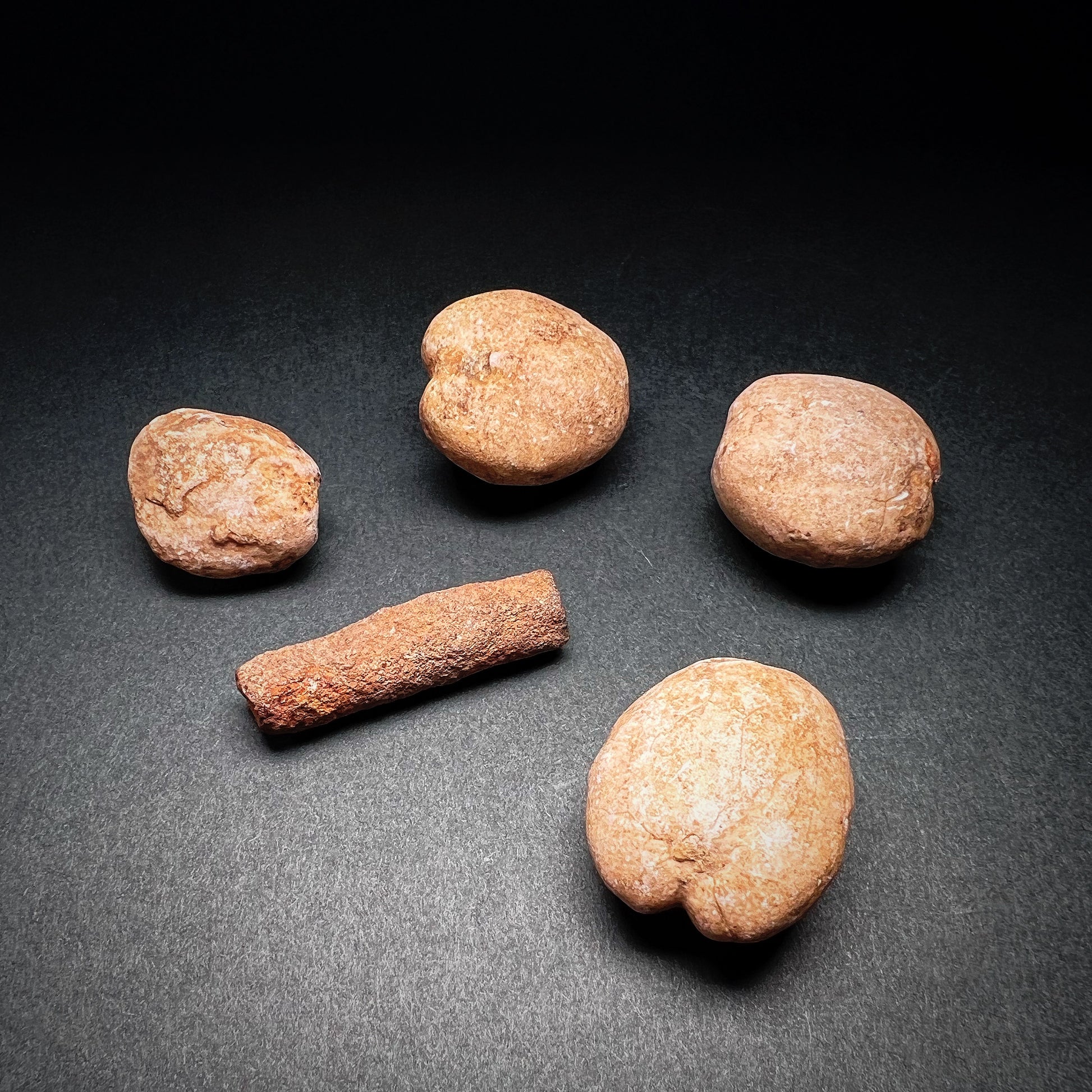Intriguing set of ancient stone and fossil grave goods or amulets. The Tenerian culture is a prehistoric industry that existed between about 4600 BC and 2500 BC in the Sahara Desert. This was during a wet period of Saharan history known as the Neolithic Subpluvial. The Tenerian culture was discovered in 2000 during an archaeological expedition led by Paul Sereno in the site known as Gobero in Niger. Gobero is hidden away within Niger's unapproachable Ténéré Desert, known to Tuareg nomads as a "desert within a desert." Two distinct prehistoric cultures were discovered at the site: the early Holocene Kiffian culture, and the middle Holocene Tenerian culture. The Kiffians were a prehistoric people who preceded the Tenerians and vanished approximately 8000 years ago, when the desert became very dry. They were skilled hunters. Bones of many large savannah animals that were discovered in the same area suggest that the Kiffians lived on the shores of a lake that was present during the Holocene Wet Phase, a period when the Sahara desert was verdant and wet. The more recent population was the Tenerian, a more lightly built people who appeared to have had a diverse economy of hunting, fishing and cattle herding. They lived during the latter part of the green Sahara, about 7,000 to 4,500 years ago. The graves show the Tenerians came to bury their dead in less flexed side postures, often including grave goods, such as clay pots, spear points, arrowheads, ground stone tools and jewelry made of hippo tusks, for an afterlife.