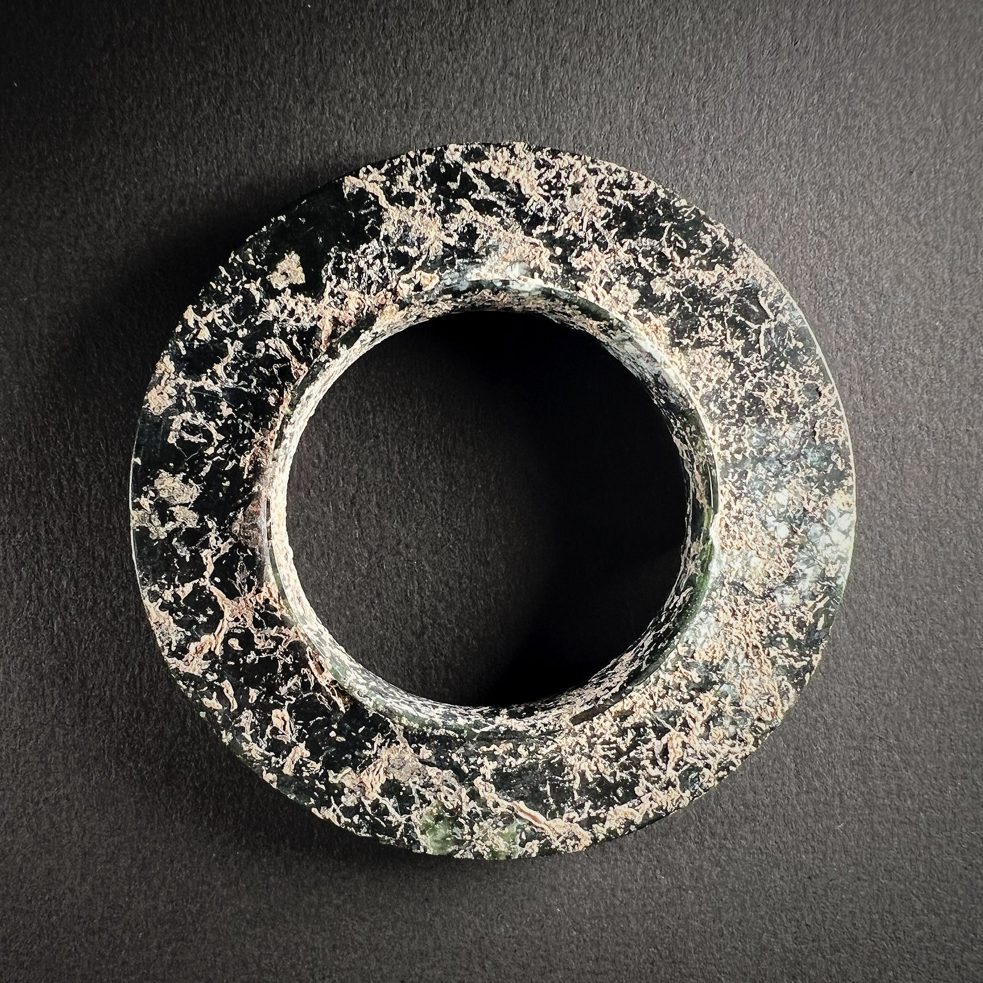 An absolutely charming and exceptionally rare deep green stone bangle, most likely fashioned from nephrite jade, distinguished by its elegant taper toward the outer rim and a raised collar encircling the central perforation. The stone displays a richly variegated dark green coloration, lending the piece both visual depth and material prestige. The form is carefully proportioned and technically refined, reflecting the advanced lapidary skills achieved by Neolithic communities in Southeast Asia.