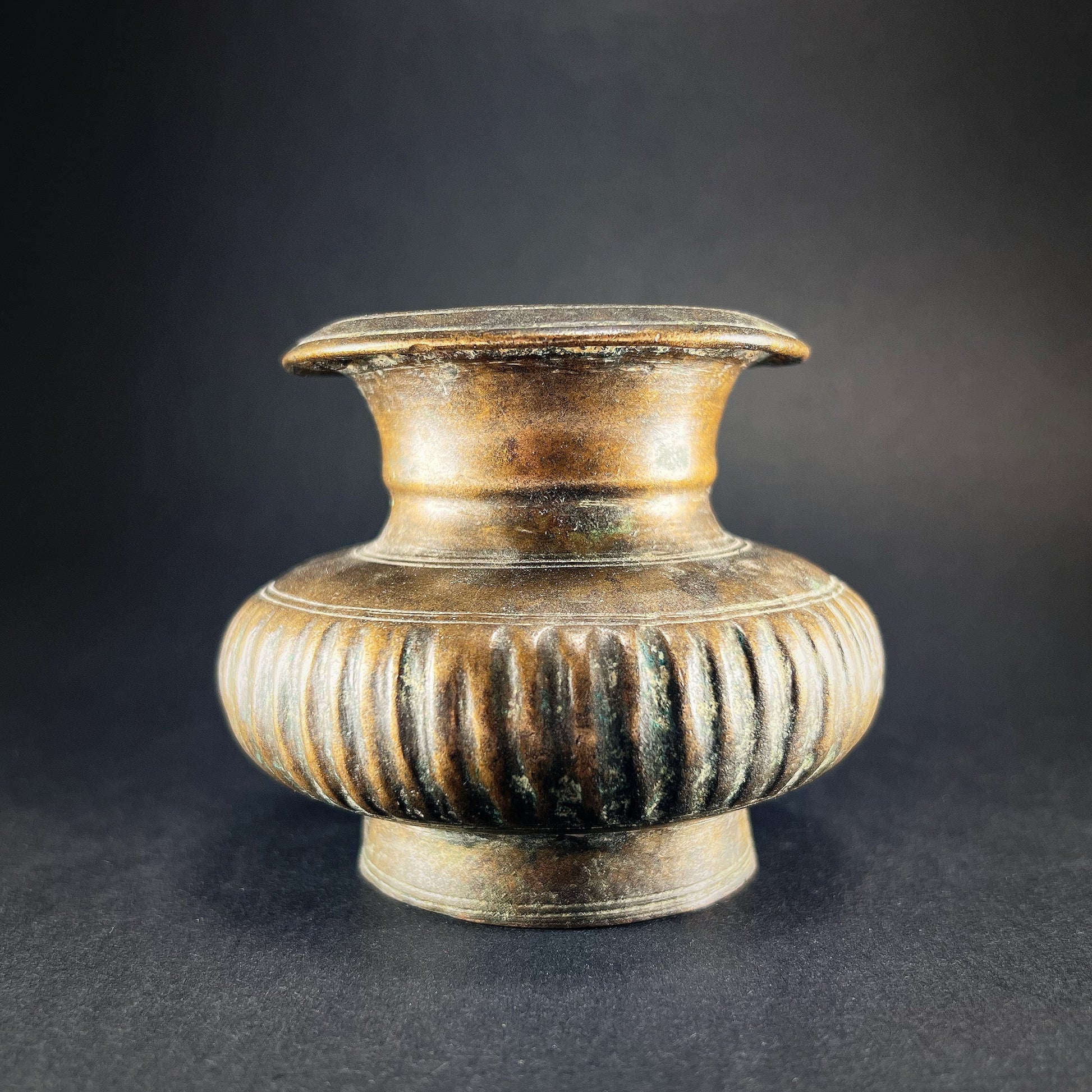 Small-sized cast bronze Karuwa of flattened and spherical form with low ring foot, lovely gadrooned sides, an everted lip around the mouth, with short baluster-form spout. The rim and neck are incised with delicate concentric circles. Age-related wear and signs of heavy use over many years. Excellent dark smooth glossy ritual patina. Size approx. 10,0cm x 9,0cm x 7,5cm.