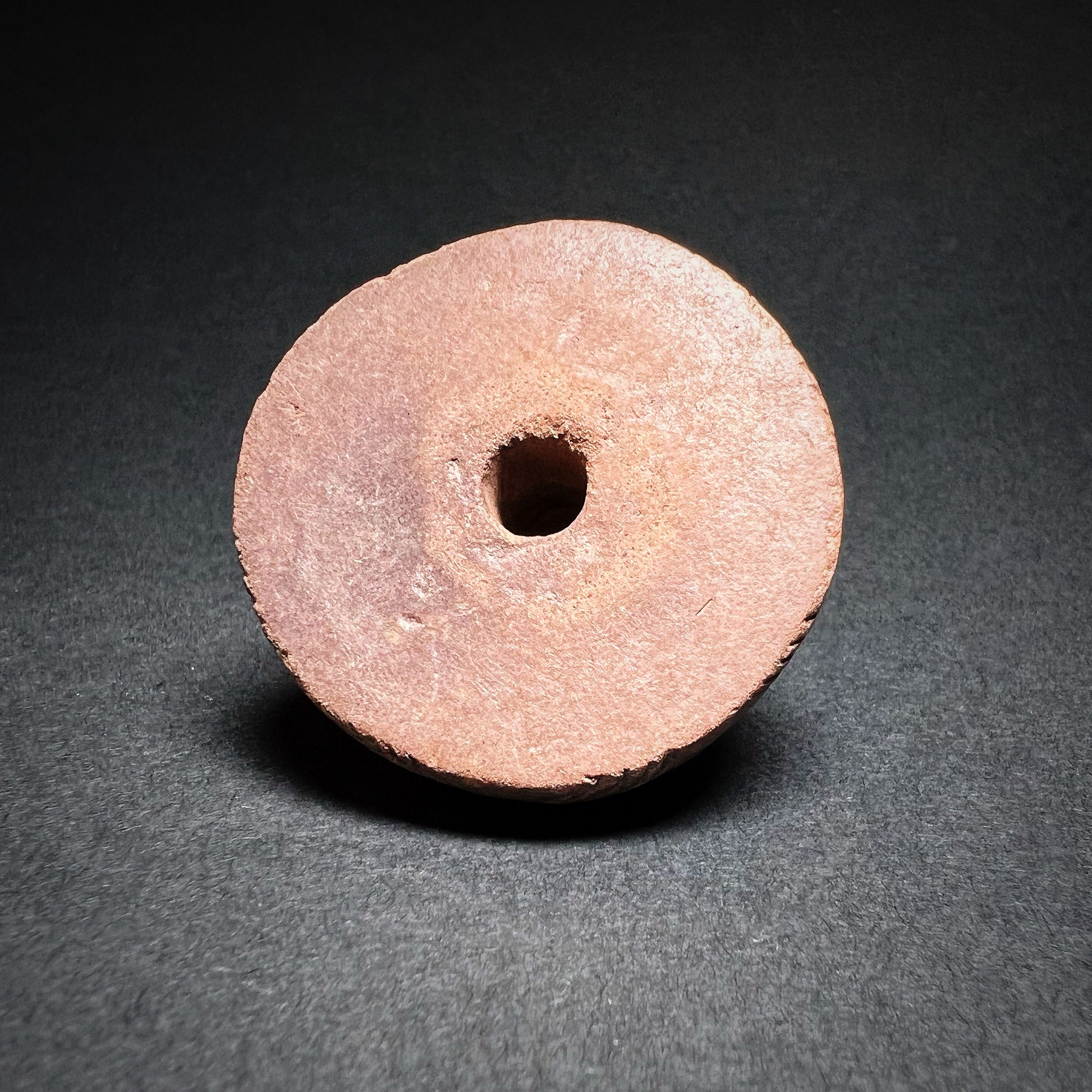 A fantastic and rare Pre-Columbian Quimbaya spindle whorl, masterfully crafted in terracotta with an exquisite deep brownish-red hue. This large, meticulously hand-polished artifact features intricately incised linear and circular motifs, reflecting the sophisticated textile traditions of the Quimbaya civilization.