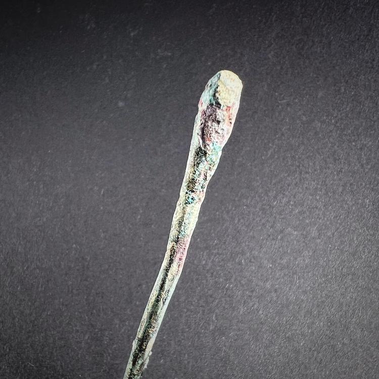 Elegant ancient Roman bronze pin featuring a straight, tapering shaft ending in a finely pointed tip. Such pins were versatile personal items in antiquity, used either to fasten garments in place—serving as a practical alternative to brooches—or as decorative hair accessories. The simplicity of its design reflects the refined functional aesthetic characteristic of Roman metalwork during the Imperial period.