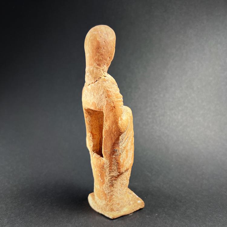 This exquisite hollow Tanagra terracotta figurine, dating from approximately 320–200 BC during the Hellenistic period, embodies the grace and refinement characteristic of these famed Boeotian sculptures. Standing contrapposto atop a rectangular plinth, the young woman is elegantly draped in a chiton and himation, which cascade in billowing folds down her slender form, enhancing the sense of fluidity and movement. The Tanagra figurines, named after the Boeotian town where many were unearthed, represent a pinnacle of Hellenistic artistry. Produced using mold-casting techniques, these figures predominantly depict draped females, though some examples include children and men.