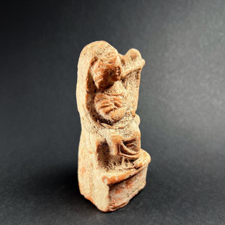 The artistry of Tanagra figurines lies in their subtle naturalism and exquisite detailing, capturing the grace and tenderness of Hellenistic aesthetics. This particular example, with its delicate modeling and emotive presence, reflects the refined sensibilities of the era, making it a remarkable testament to the artistic achievements of ancient Greece.