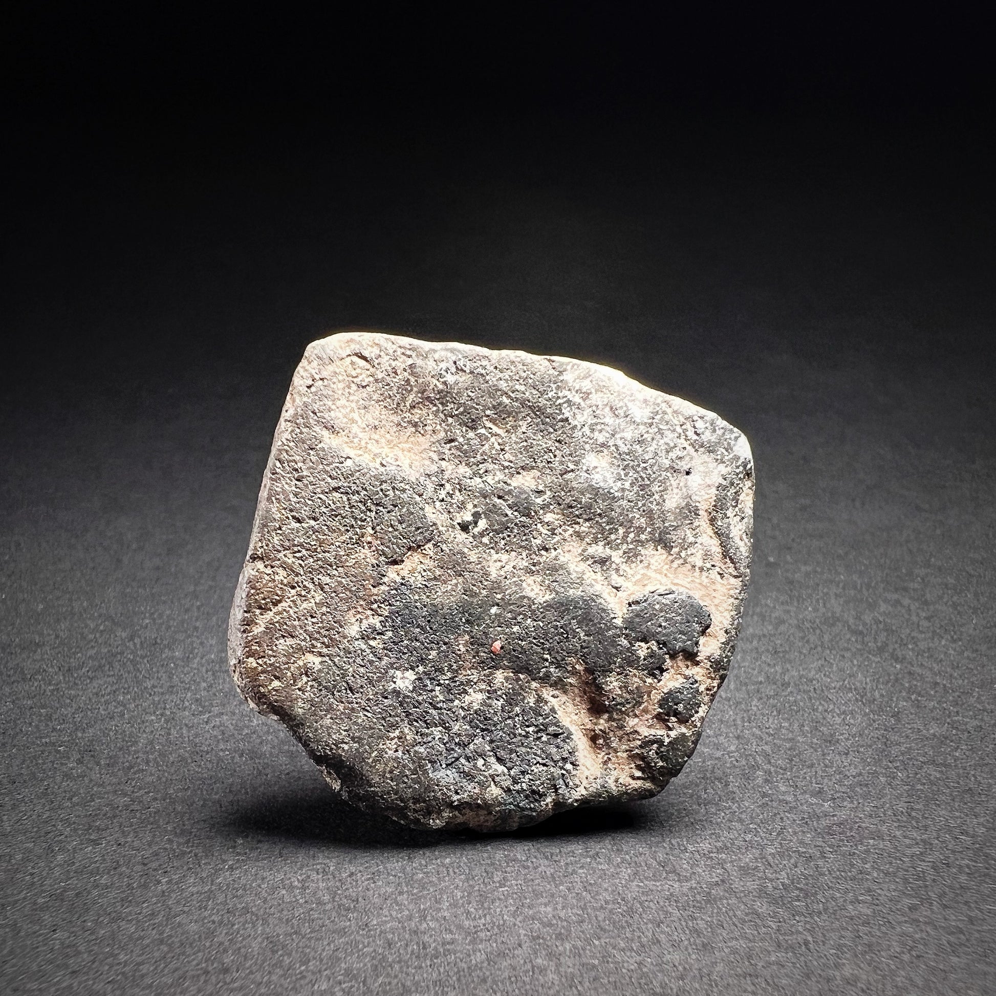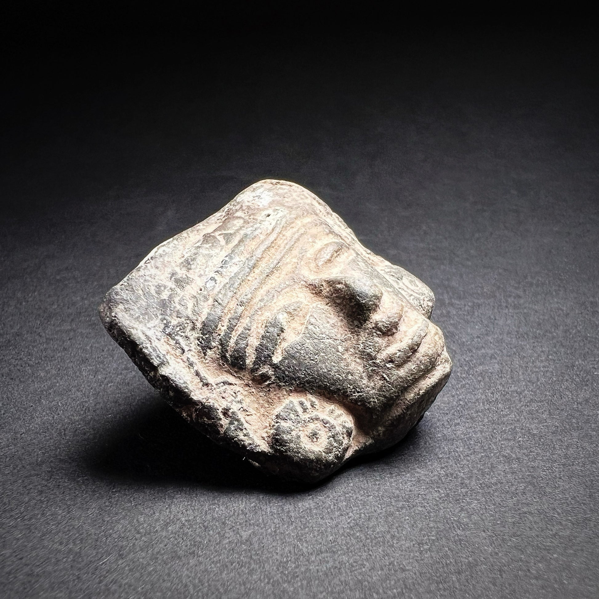 Good condition. Surface wear and abrasions commensurate with age, nicks and chip, with fading to some finer features, and light encrustations within recessed areas. Nice earthen deposits throughout. Size approx. 3,3cm x 3,4cm x 1,9cm.