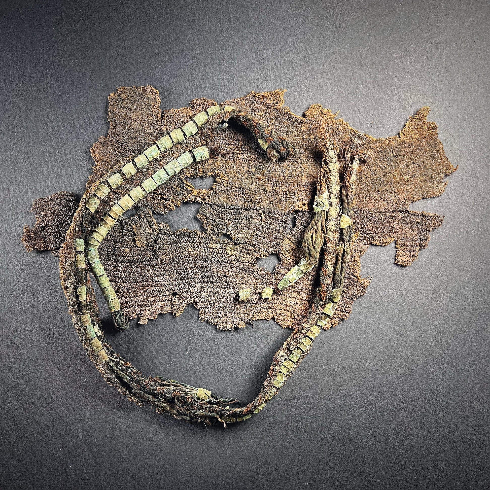 A truly magnificent and exceptionally rare set of Viking Age textile fragments, featuring original bronze ring decorations. These remarkable remnants offer a direct connection to the craftsmanship and daily life of the Norse people during the height of their legendary era of exploration, conquest, and trade.