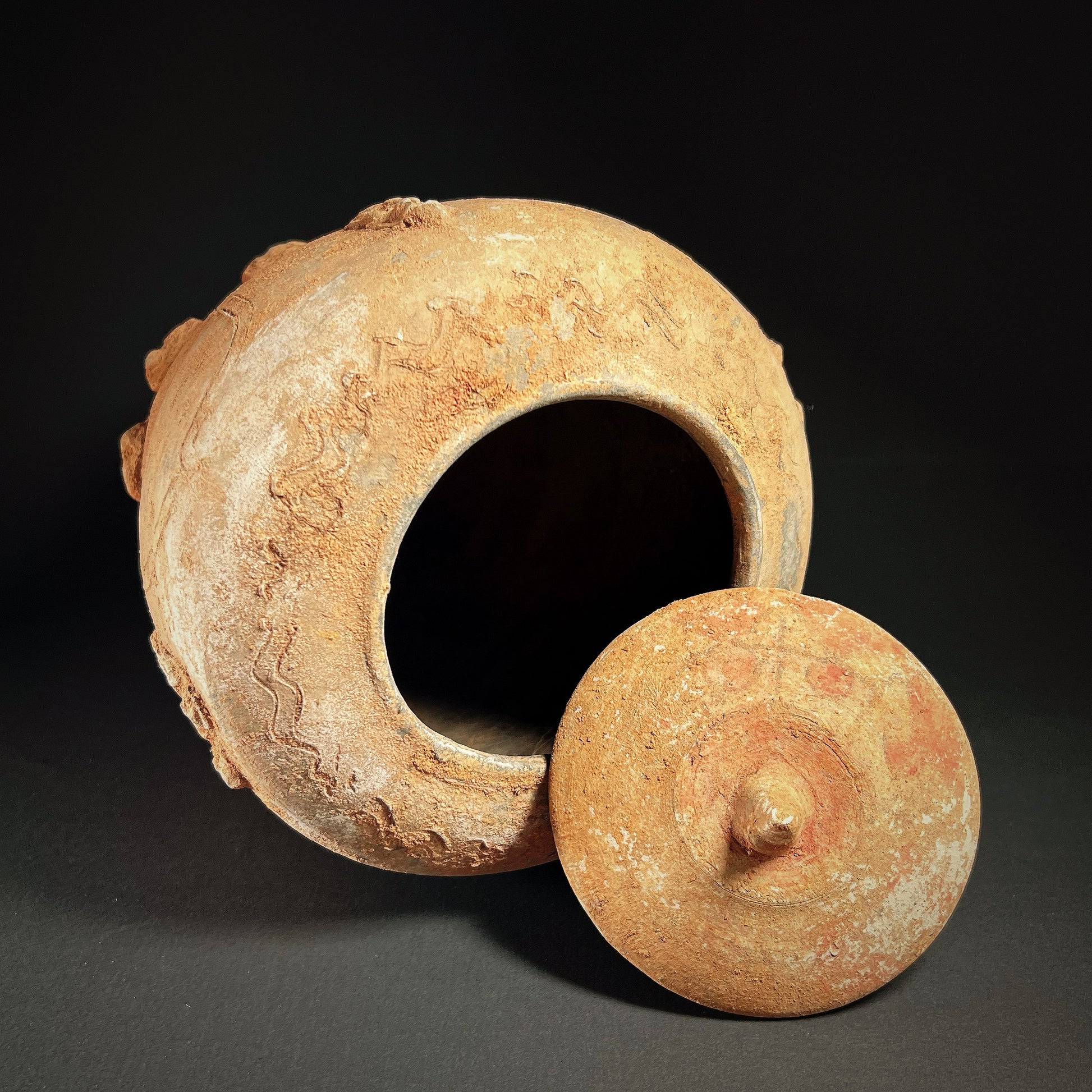 The surface of the body is richly adorned with broad upright Bajiao (banana) leaves, an auspicious Buddhist floral motif symbolizing spiritual growth and purity. Around the upper body, moulded appliqués of human figures are interspersed with the twelve animals of the Chinese zodiac on the lower register. In Buddhist cosmology, these twelve creatures are believed to have journeyed together to pay homage to the historical Buddha before his final nirvana, embodying the unity of the natural and spiritual worlds. Additional decoration includes incised wavy lines encircling the shoulder, while the convex lid—surmounted by a delicate conical knob—is cold-painted with geometric motifs in black and red pigments. On the underside of the lid, Sanskrit-style characters rendered in red pigment remain clearly visible. The vessel’s warm yellowish-brown surface coloration results from the iron-rich soils of Yunnan.